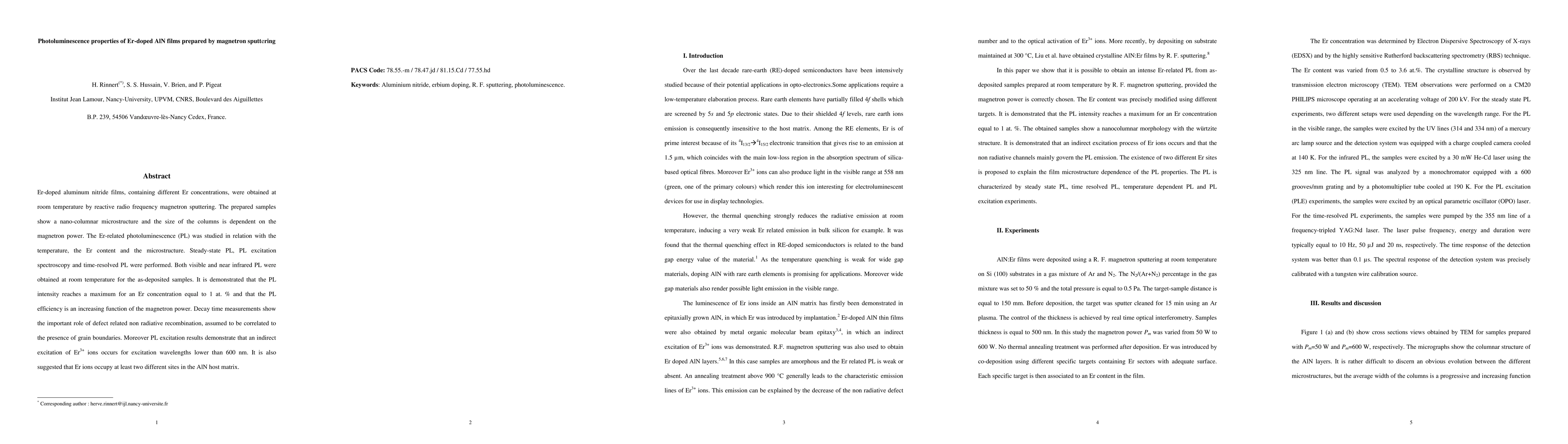 This study investigates Er-doped AlN films prepared via magnetron sputtering, revealing their nano-columnar microstructure and photoluminescence properties. Optimal PL intensity and efficiency are achieved at 1 at. % Er doping and higher magnetron power, with significant non-radiative recombination due to grain boundaries.
