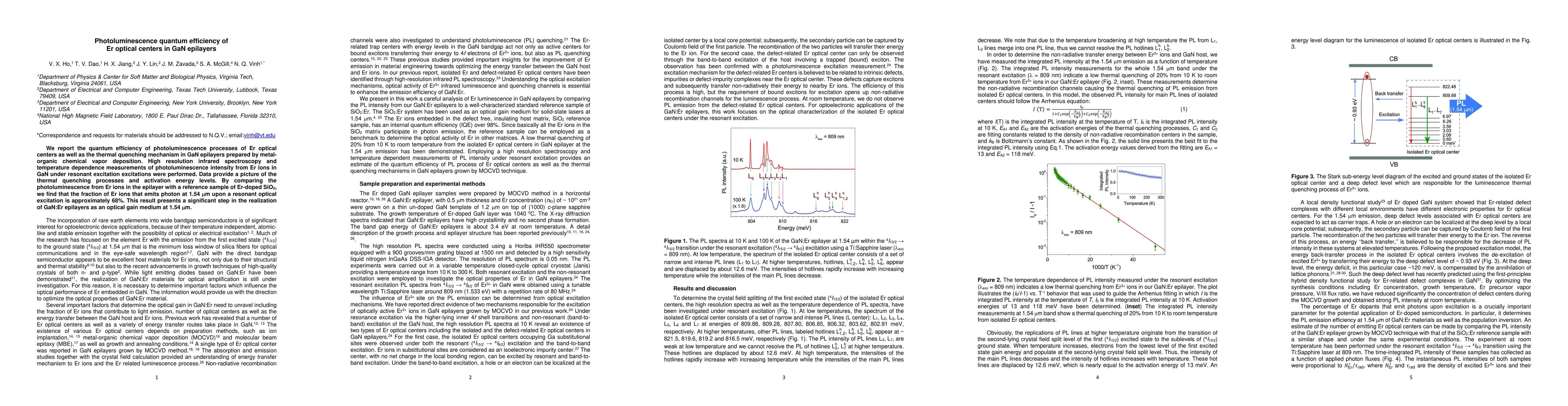 This paper investigates the photoluminescence quantum efficiency of Er optical centers in GaN epilayers, revealing a 68% efficiency for photon emission at 1.54 microns. The study identifies thermal quenching mechanisms and activation energy levels, positioning GaN:Er epilayers as a promising optical gain medium.