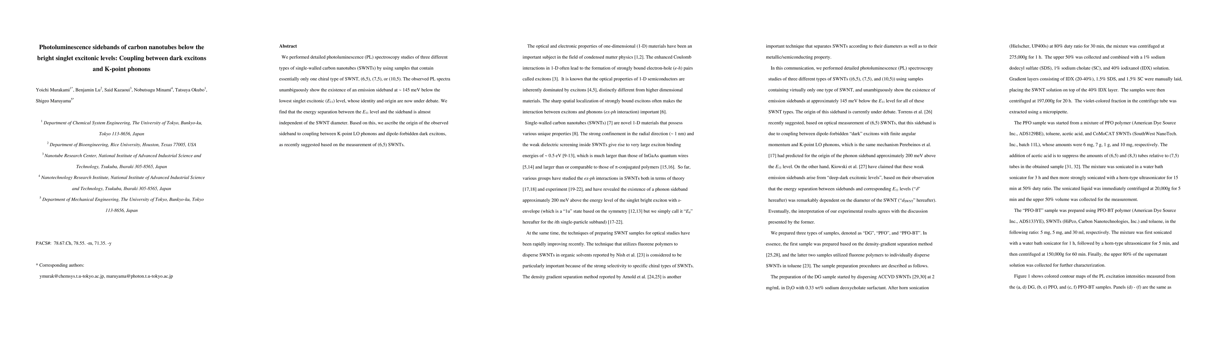 We performed detailed photoluminescence (PL) spectroscopy studies of three different types of single-walled carbon nanotubes (SWNTs) by using samples that contain essentially only one chiral type of SWNT, (6,5), (7,5), or (10,5). The observed PL spectra unambiguously show the existence of an emission sideband at ~ 145 meV below the lowest singlet excitonic (E11) level, whose identity and origin are now under debate. We find that the energy separation between the E11 level and the sideband is almost independent of the SWNT diameter. Based on this, we ascribe the origin of the observed sideband to coupling between K-point LO phonons and dipole-forbidden dark excitons, as recently suggested based on the measurement of (6,5) SWNTs.