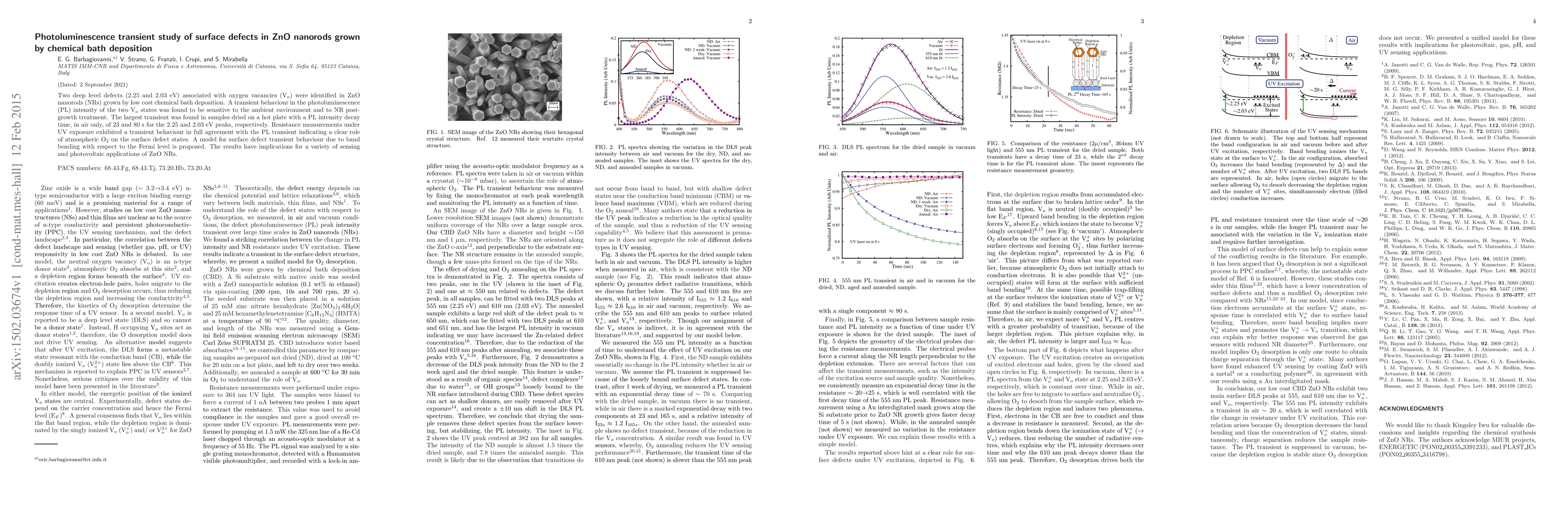This study identifies two deep level defects in ZnO nanorods grown via low-cost chemical bath deposition, linked to oxygen vacancies. The defects exhibit transient photoluminescence behavior influenced by ambient conditions and post-growth treatment, with implications for sensing and photovoltaic applications of ZnO NRs.