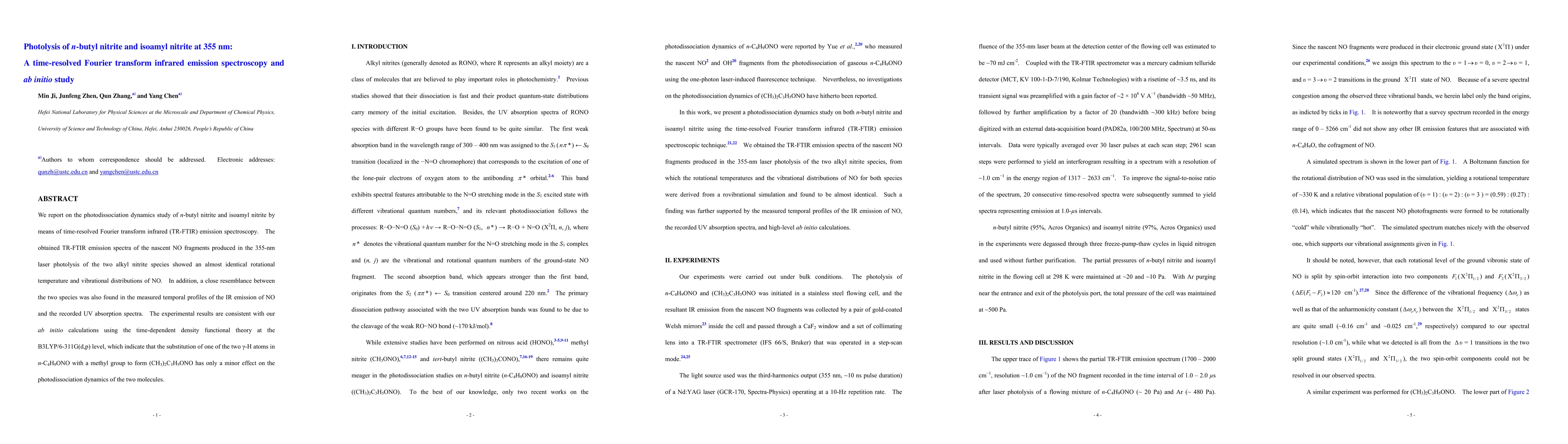 The study employed time-resolved Fourier transform infrared (TR-FTIR) emission spectroscopy and ab initio calculations using time-dependent density functional theory (TD-DFT) at the B3LYP/6-311G(d,p) level to investigate the photodissociation dynamics of n-butyl nitrite and isoamyl nitrite upon 355-nm laser photolysis.