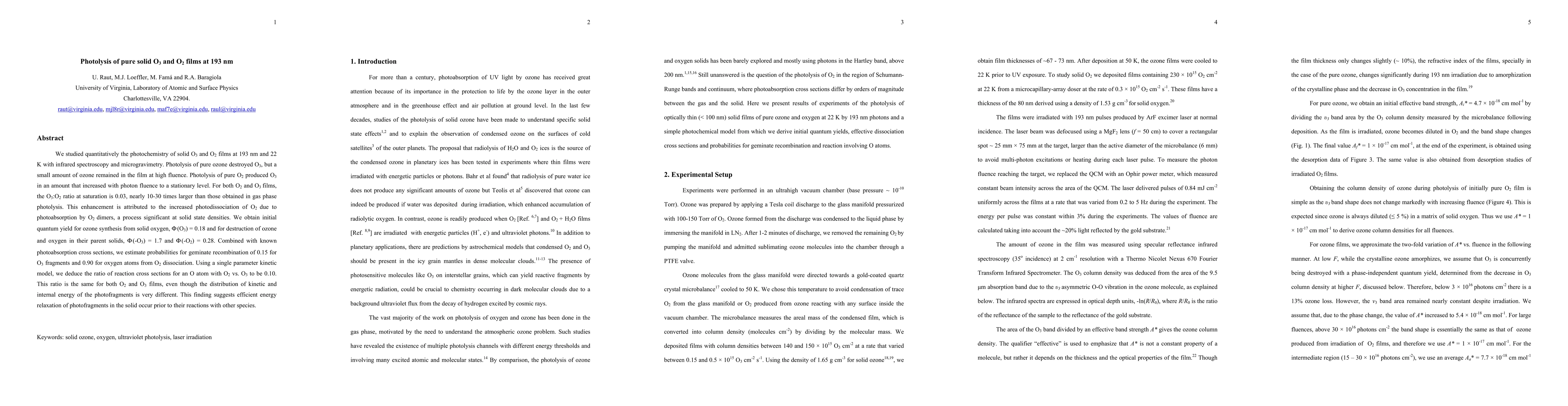 Research shows that photolysis of pure solid ozone and oxygen films at 193nm produces ozone in a higher ratio than gas-phase reactions, with the O3:O2 ratio increasing to 0.03 at saturation. This is attributed to increased photodissociation of oxygen due to photoabsorption by oxygen dimers.