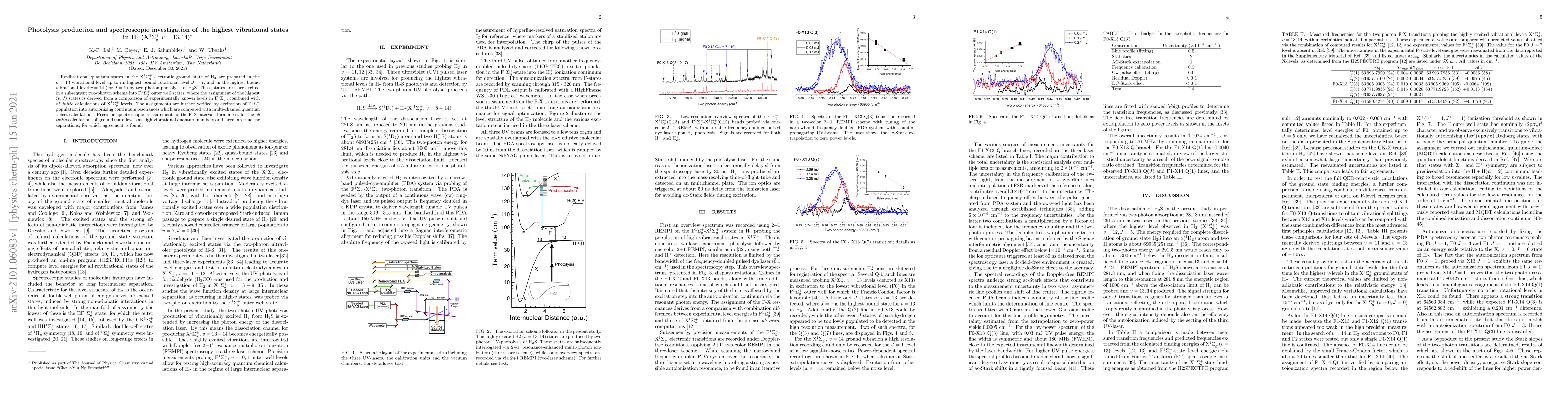 This paper investigates the photolysis production and spectroscopy of the highest vibrational states in H$_2$ (X$^1\Sigma_g^+$ $v=13,14$) using two-photon photolysis and laser excitation, with assignments verified through autoionizing resonances and \emph{ab initio} calculations. Precision spectroscopic measurements confirm the accuracy of \emph{ab initio} calculations for high vibrational states.