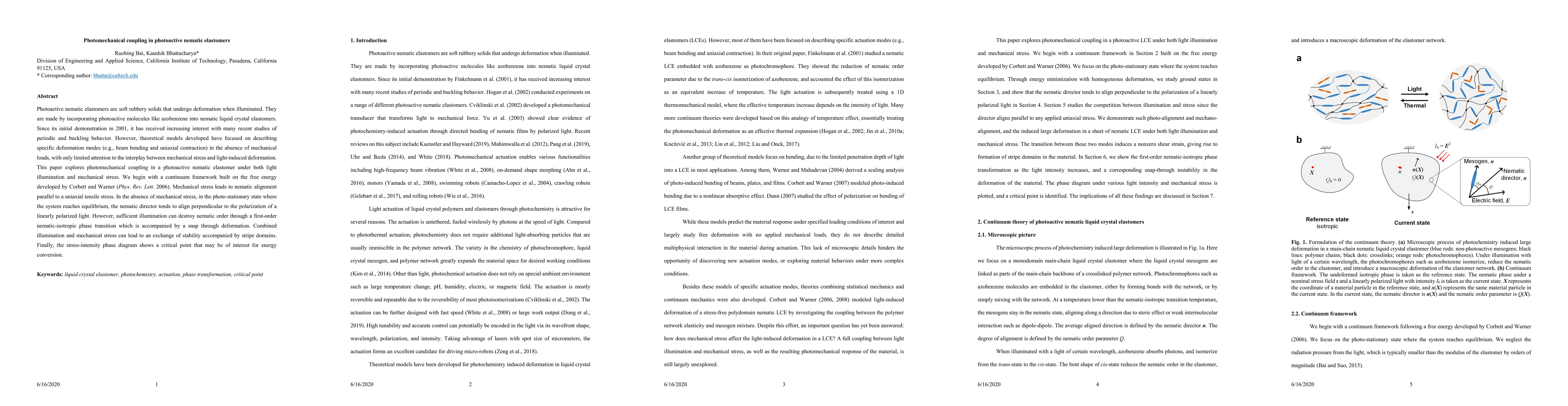This paper investigates photomechanical coupling in photoactive nematic elastomers, revealing how mechanical stress and light illumination interact to influence deformation. The study finds that mechanical stress can align nematic molecules while light can induce nematic-isotropic phase transitions, leading to complex deformation behaviors such as stripe domains and snap-through effects.