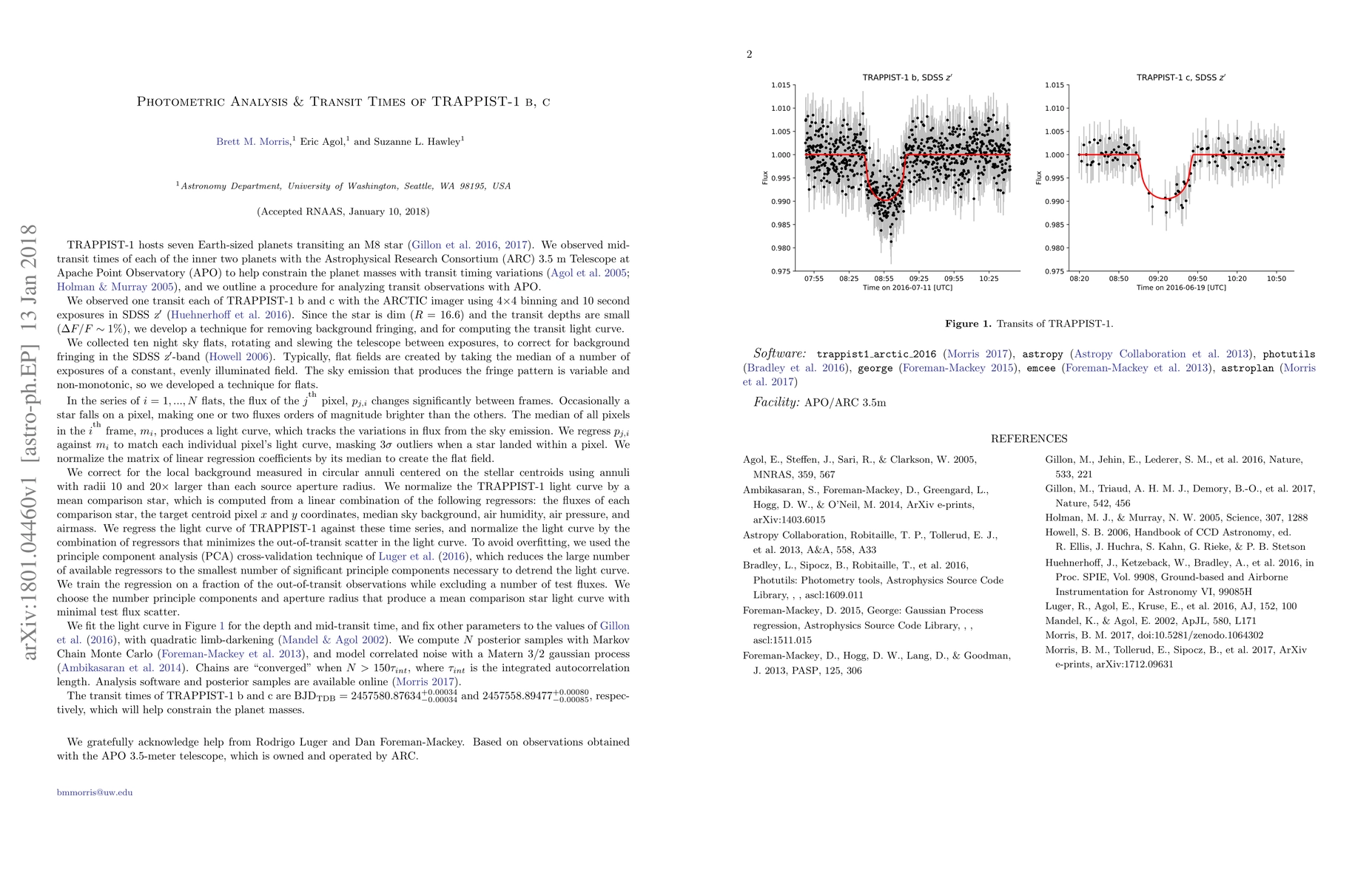 This study uses the Astrophysical Research Consortium (ARC) 3.5 m Telescope to observe mid-transit times of TRAPPIST-1 b and c, providing precise timing data that aids in constraining the planet masses through transit timing variations. The mid-transit times are $\mathrm{BJD}_{\mathrm{TDB}} = 2457580.87634^{+0.00034}_{-0.00034}$ for TRAPPIST-1 b and $2457558.89477^{+0.00080}_{-0.00085}$ for TRAPPIST-1 c.