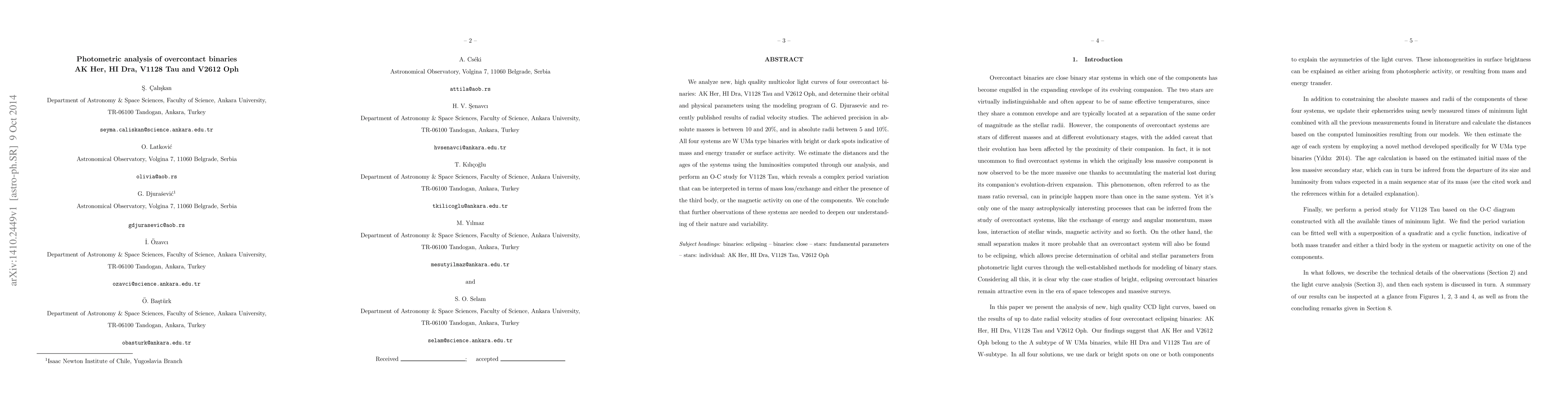 We analyze new, high quality multicolor light curves of four overcontact binaries: AK Her, HI Dra, V1128 Tau and V2612 Oph, and determine their orbital and physical parameters using the modeling program of G. Djurasevic and recently published results of radial velocity studies. The achieved precision in absolute masses is between 10 and 20%, and in absolute radii between 5 and 10%. All four systems are W UMa type binaries with bright or dark spots indicative of mass and energy transfer or surface activity. We estimate the distances and the ages of the systems using the luminosities computed through our analysis, and perform an O-C study for V1128 Tau, which reveals a complex period variation that can be interpreted in terms of mass loss/exchange and either the presence of the third body, or the magnetic activity on one of the components. We conclude that further observations of these systems are needed to deepen our understanding of their nature and variability.