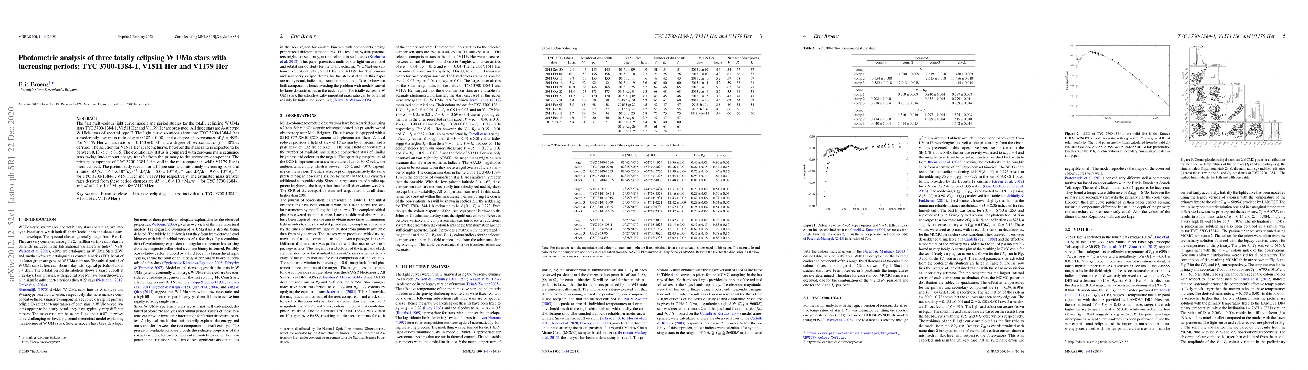 The first multi-colour light curve models and period studies for the totally eclipsing W UMa stars TYC 3700-1384-1, V1511 Her and V1179 Her are presented. All three stars are A-subtype W UMa stars of spectral type F. The light curve solutions show that TYC 3700-1384-1 has a moderately low mass ratio of q = 0.182 +/- 0.001 and a degree of overcontact of f = 49%. For V1179 Her a mass ratio q = 0.153 +/- 0.001 and a degree of overcontact of f = 48% is derived. The solution for V1511 Her is inconclusive, however the mass ratio is expected to be between 0.13 < q < 0.15. The evolutionary status is compared with zero-age main sequence stars taking into account energy transfer from the primary to the secondary component. The primary component of TYC 3700-1384-1 fits well in the main-sequence, while V1179 Her is more evolved. The period study reveals for all three stars a continuously increasing period at a rate of dP/dt = 6.1x10-7 d/yr, dP/dt = 5.0x10-7 d/yr and dP/dt = 9.6x10-7 d/yr for TYC 3700-1384-1, V1511 Her and V1179 Her respectively. The estimated mass transfer rates derived from these period changes are 1.6x10-7 solMass/yr for TYC 3700-1384-1 and 1.9x10-7 solMass/yr for V1179 Her.