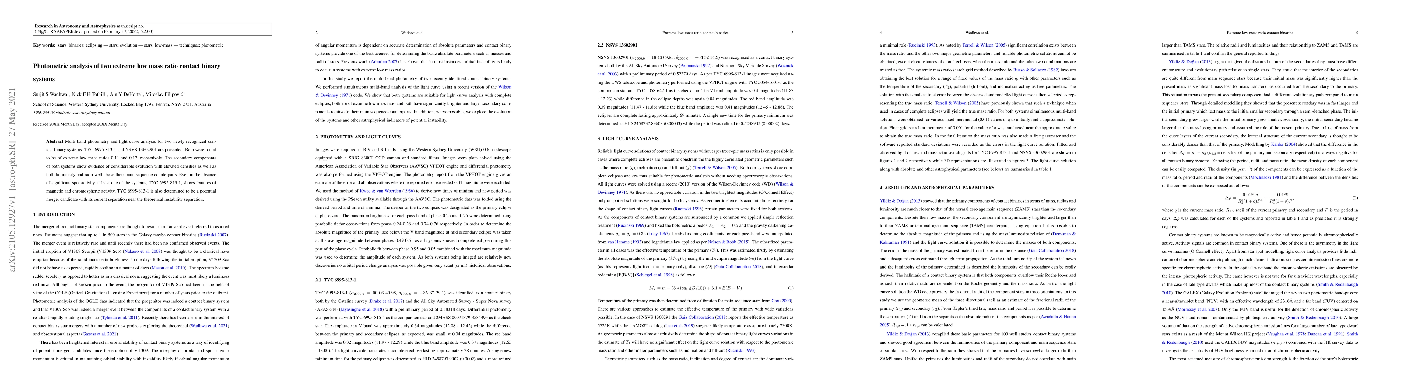 Multi band photometry and light curve analysis for two newly recognized contact binary systems, TYC 6995-813-1 and NSVS 13602901 are presented. Both were found to be of extreme low mass ratios 0.11 and 0.17, respectively. The secondary components of both systems show evidence of considerable evolution with elevated densities as well as both luminosity and radii well above their main sequence counterparts. Even in the absence of significant spot activity at least one of the systems, TYC 6995-813-1, shows features of magnetic and chromospheric activity. TYC 6995-813-1 is also determined to be a potential merger candidate with its current separation near the theoretical instability separation.