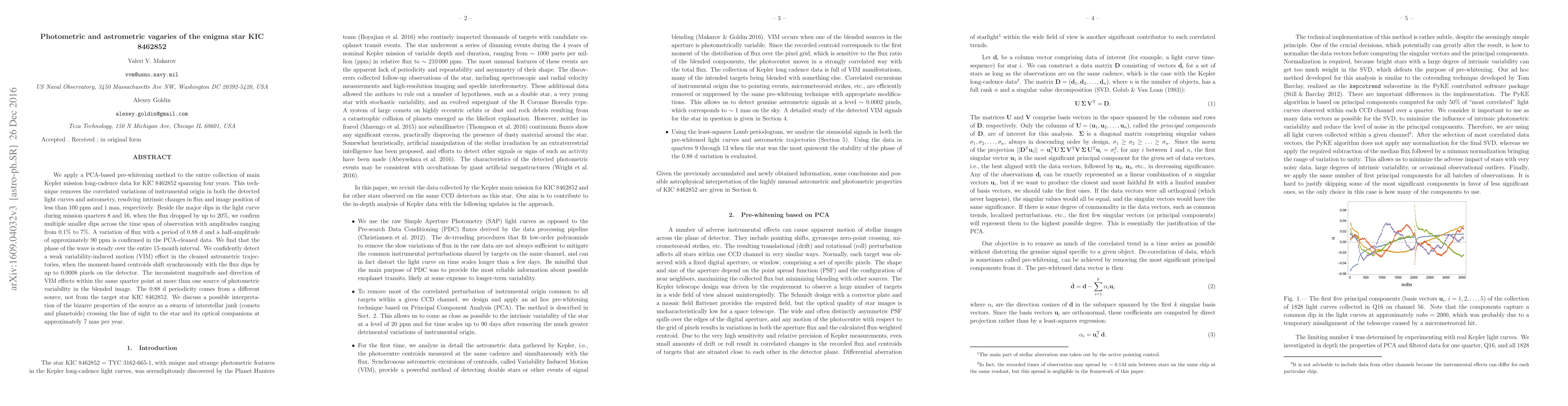 We apply a PCA-based pre-whitening method to the entire collection of main Kepler mission long-cadence data for KIC 8462852 spanning four years. This technique removes the correlated variations of instrumental origin in both the detected light curves and astrometry, resolving intrinsic changes in flux and image position of less than 100 ppm and 1 mas, respectively. Beside the major dips in the light curve during mission quarters 8 and 16, when the flux dropped by up to 20%, we confirm multiple smaller dips across the time span of observation with amplitudes ranging from 0.1% to 7%. A variation of flux with a period of 0.88 d and a half-amplitude of approximately 90 ppm is confirmed in the PCA-cleaned data. We find that the phase of the wave is steady over the entire 15-month interval. We confidently detect a weak variability-induced motion (VIM) effect in the cleaned astrometric trajectories, when the moment-based centroids shift synchronously with the flux dips by up to 0.0008 pixels on the detector. The inconsistent magnitude and direction of VIM effects within the same quarter point at more than one source of photometric variability in the blended image. The 0.88 d periodicity comes from a different source, not from the target star KIC 8462852. We discuss a possible interpretation of the bizarre properties of the source as a swarm of interstellar junk (comets and planetoids) crossing the line of sight to the star and its optical companions at approximately 7 mas per year.