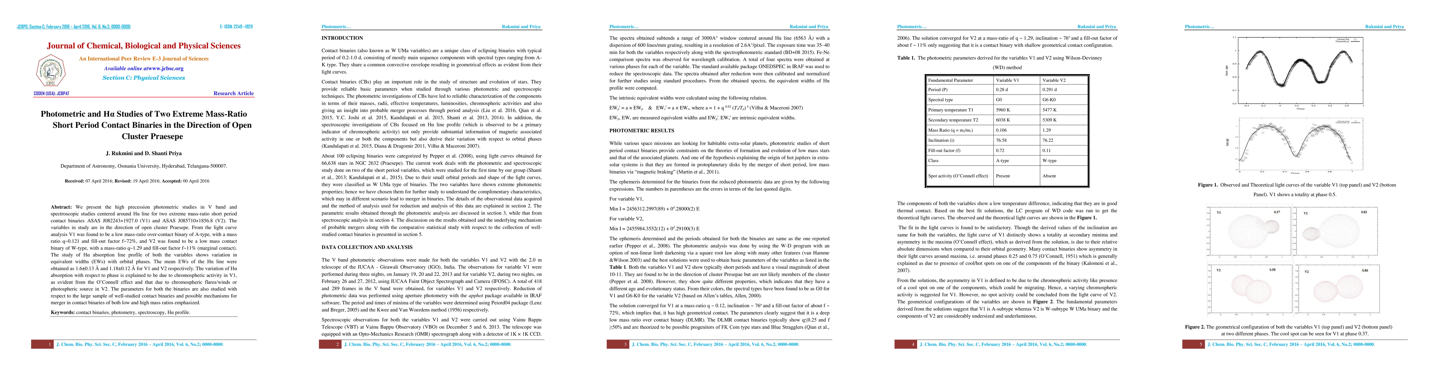 We present the high precession photometric studies in V band and spectroscopic studies centered around H-alpha line for two extreme mass-ratio short period contact binaries ASAS J082243+1927.0 (V1) and ASAS J085710+1856.8 (V2). The variables in study are in the direction of open cluster Praesepe. From the light curve analysis V1 was found to be a low mass-ratio over-contact binary of A-type, with a mass ratio q 0.121 and fill-out factor f 72%, and V2 was found to be a low mass contact binary of W-type, with a mass-ratio q 1.29 and fill-out factor f 11% (marginal contact). The study of H-alpha absorption line profile of both the variables shows variation in equivalent widths (EWs) with orbital phases. The mean EWs of the H-alpha line were obtained as 1.6+or-0.13 A and 1.18+or-0.12 A for V1 and V2 respectively. The variation of H-alpha absorption with respect to phase is explained to be due to chromospheric activity in V1, as evident from the O Connell effect and that due to chromospheric flares, winds or photospheric source in V2. The parameters for both the binaries are also studied with respect to the large sample of well-studied contact binaries and possible mechanisms for merger in contact binaries of both low and high mass ratios emphasized.