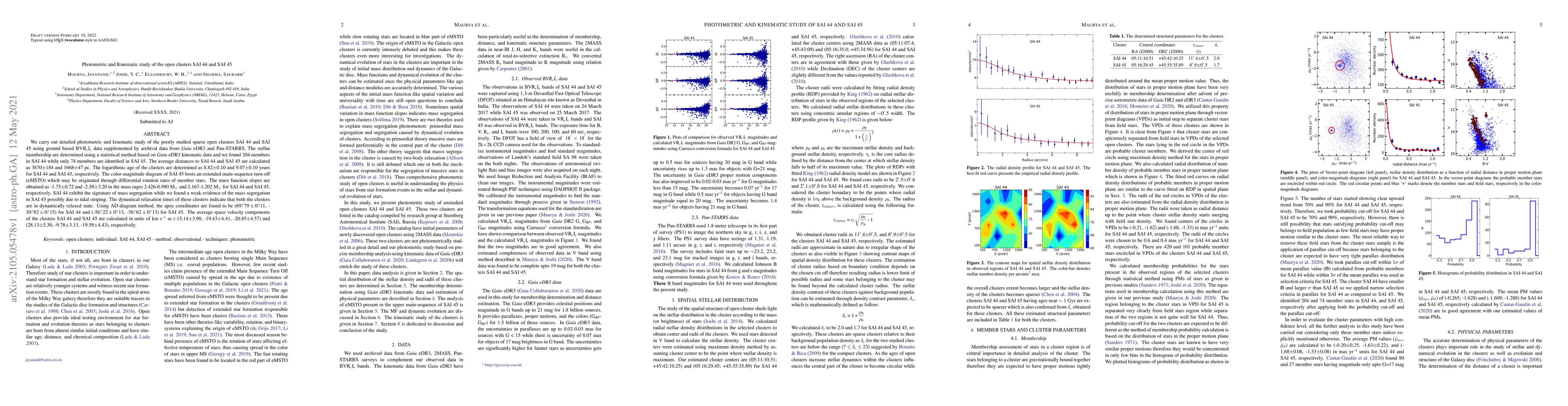 This study details a photometric and kinematic analysis of open clusters SAI 44 and SAI 45 using ground-based and Gaia eDR3 data. It identifies 204 and 74 members, calculates their distances and ages, and finds an extended main-sequence turn-off in SAI 45. Mass segregation is observed in SAI 44 and weakly in SAI 45, with both clusters being dynamically relaxed. The space velocity components are also determined for both clusters.