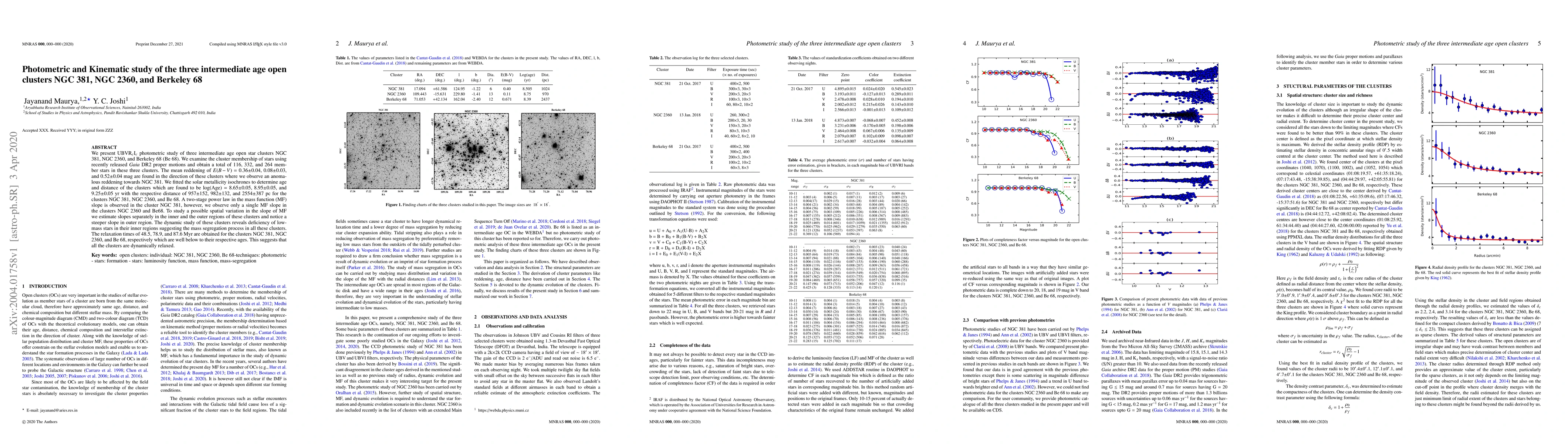 This study conducts a detailed photometric and kinematic analysis of three intermediate-age open clusters—NGC 381, NGC 2360, and Berkeley 68—using UBVRcIc data and Gaia DR2 proper motions. The research identifies member stars, determines the clusters' ages and distances, and observes mass segregation and a two-stage power law in the mass function slope for NGC 381, indicating dynamic relaxation in all clusters.