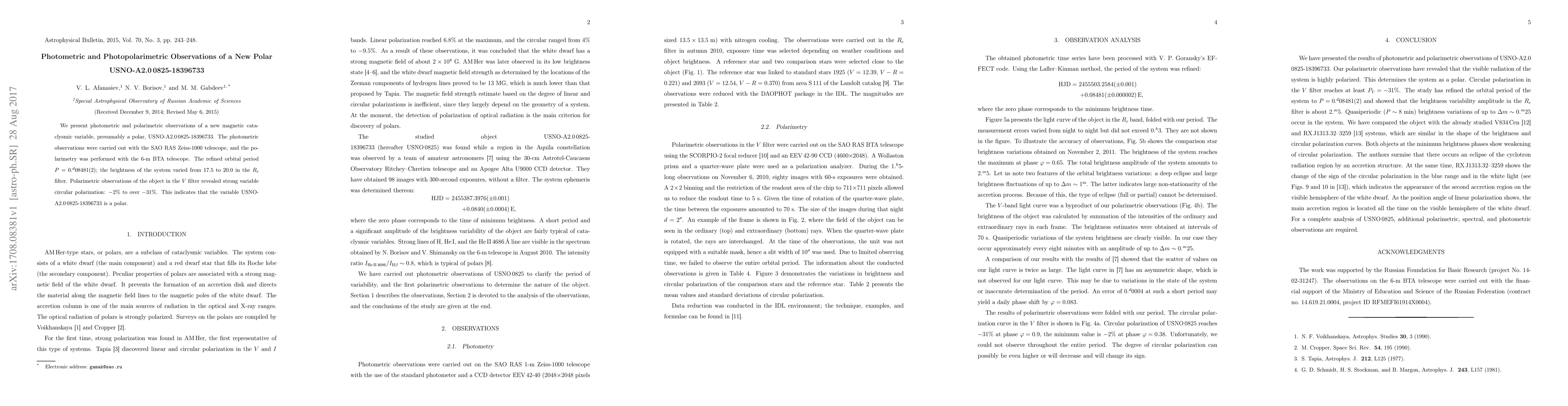 We present photometric and polarimetric observations of a new magnetic cataclysmic variable, presumably a polar, USNO-A2.0 0825-18396733. The photometric observations were carried out with the SAO RAS Zeiss-1000 telescope, and the polarimetry was performed with the 6-m BTA telescope. The redefined orbital period P = 0:d08481(2); the brightness of the system varied from 17:5 to 20:0 in the Rc filter. Polarimetric observations of the object in the V filter revealed strong variable circular polarization: -2% to over -31%. This indicates that the variable USNO-A2.0 0825-18396733 is a polar.