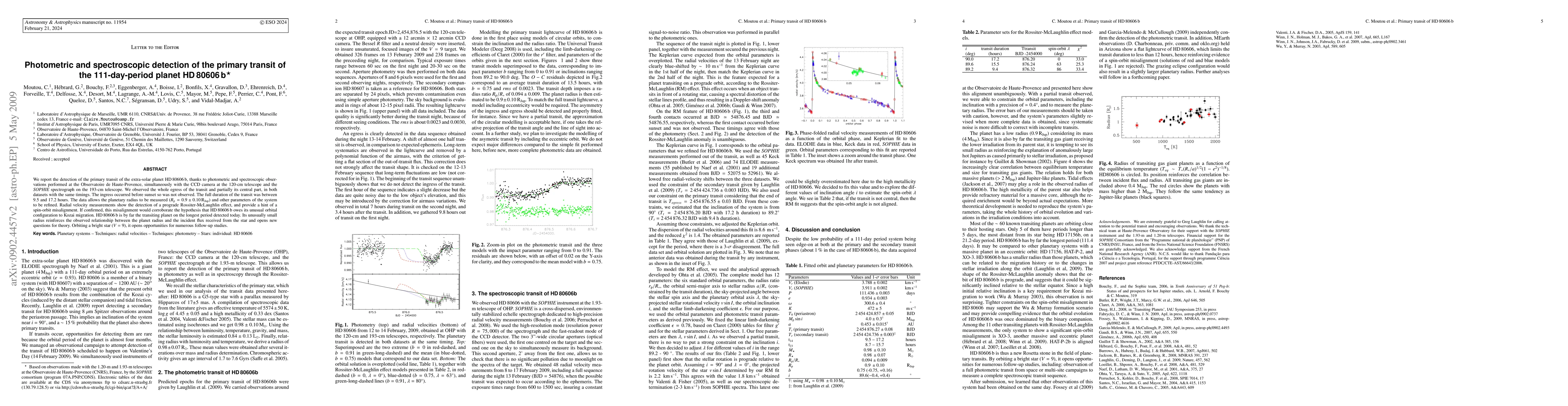 This paper reports the detection of the primary transit of the long-period exoplanet HD 80606 b using photometric and spectroscopic observations, revealing its small radius and suggesting potential spin-orbit misalignment. The transit duration and planetary radius measurements provide insights into the planet's unusual orbital configuration and its relationship with the star's incident flux.
