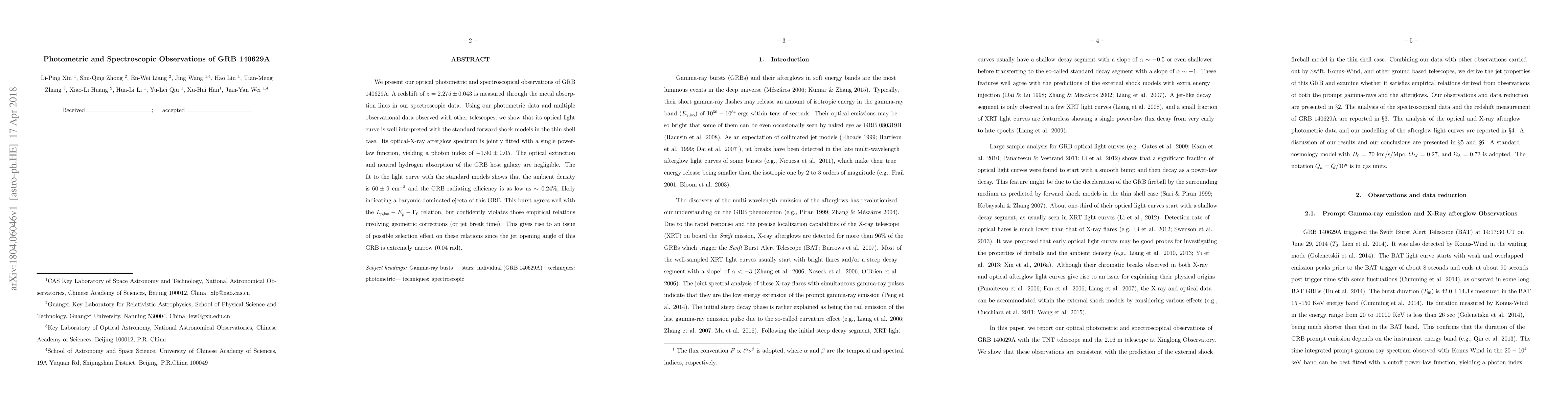 We present our optical photometric and spectroscopical observations of GRB 140629A. A redshift of $z=2.275\pm0.043$ is measured through the metal absorption lines in our spectroscopic data. Using our photometric data and multiple observational data observed with other telescopes, we show that its optical light curve is well interpreted with the standard forward shock models in the thin shell case. Its optical-X-ray afterglow spectrum is jointly fitted with a single power-law function, yielding a photon index of $-1.90\pm 0.05$. The optical extinction and neutral hydrogen absorption of the GRB host galaxy are negligible. The fit to the light curve with the standard models shows that the ambient density is $60\pm 9$ cm$^{-3}$ and the GRB radiating efficiency is as low as $\sim 0.24\%$, likely indicating a baryonic-dominated ejecta of this GRB. This burst agrees well with the $L_{\rm p, iso}-E_p^{'}-\Gamma_0$ relation, but confidently violates those empirical relations involving geometric corrections (or jet break time). This gives rise to an issue of possible selection effect on these relations since the jet opening angle of this GRB is extremely narrow (0.04 rad).