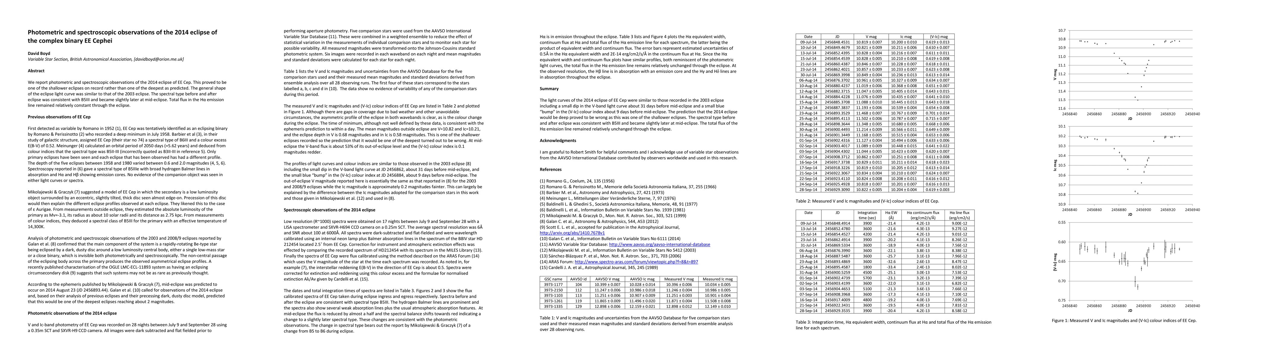 The 2014 eclipse of EE Cephei was shallower than predicted, with a similar light curve shape to the 2003 eclipse. The star's spectral type shifted slightly during the event, but its H-alpha emission line flux remained relatively constant.