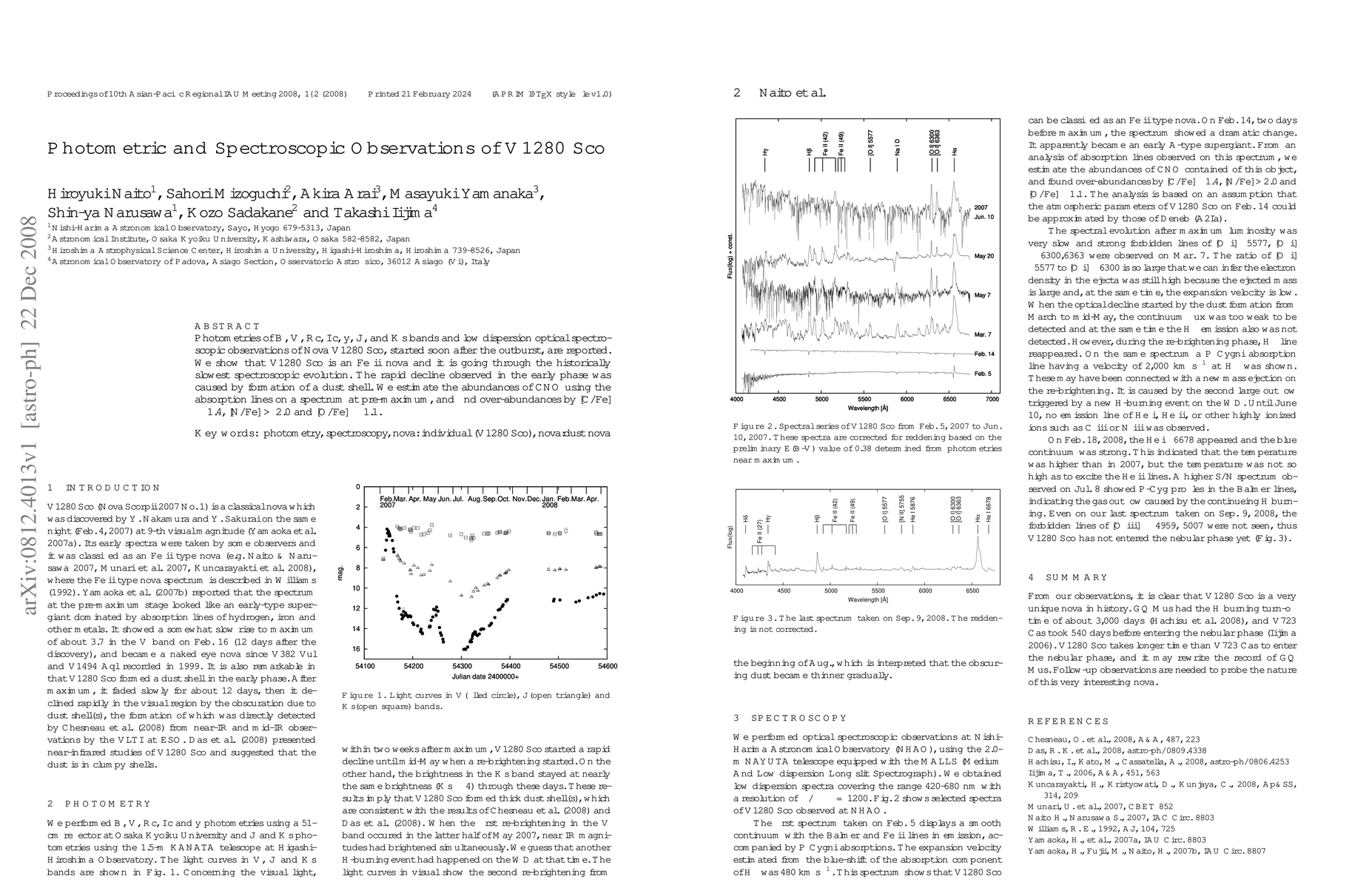 Photometries of B, V, Rc, Ic, y, J, and Ks bands and low dispersion optical spectroscopic observations of Nova V1280 Sco, started soon after the outburst, are reported. We show that V1280 Sco is an Fe II nova and it is going through the historically slowest spectroscopic evolution. The rapid decline observed in the early phase was caused by formation of a dust shell. We estimate the abundances of CNO using the absorption lines on a spectrum at pre-maximum, and find over-abundances by [C/Fe] ~ 1.4, [N/Fe] > 2.0 and [O/Fe] ~ 1.1.