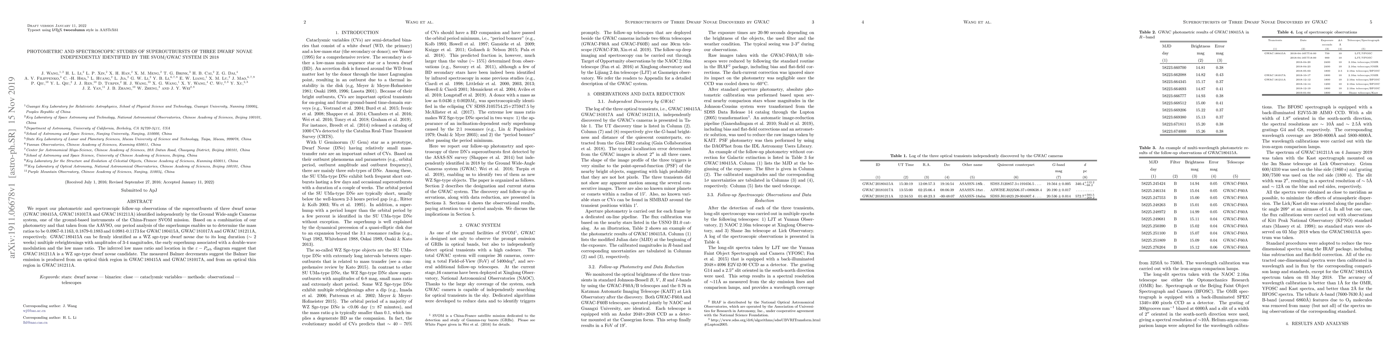 Researchers studied superoutbursts of three dwarf novae independently identified by the SVOM/GWAC system in 2018, determining mass ratios and characterizing their properties through photometry and spectroscopy.