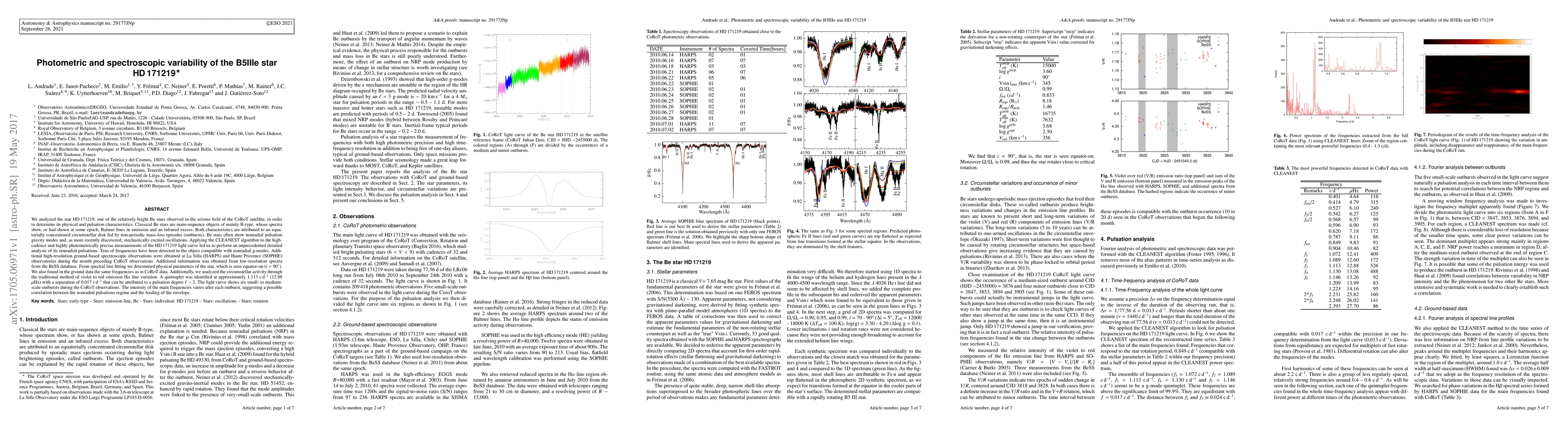 We analyzed the star HD 171219, one of the relatively bright Be stars observed in the seismo field of the CoRoT satellite, in order to determine its physical and pulsation characteristics. Classical Be stars are main-sequence objects of mainly B-type, whose spectra show, or had shown at some epoch, Balmer lines in emission and an infrared excess. Both characteristics are attributed to an equatorially concentrated circumstellar disk fed by non-periodic mass-loss episodes (outbursts). Be stars often show nonradial pulsation gravity modes and, as more recently discovered, stochastically excited oscillations. Applying the CLEANEST algorithm to the high-cadence and highly photometrically precise measurements of the HD 171219 light curve led us to perform an unprecedented detailed analysis of its nonradial pulsations. Tens of frequencies have been detected in the object compatible with nonradial g-modes. Additional high-resolution ground-based spectroscopic observations were obtained at La Silla (HARPS) and Haute Provence (SOPHIE) observatories during the month preceding CoRoT observations. Additional information was obtained from low-resolution spectra from the BeSS database. From spectral line fitting we determined physical parameters of the star, which is seen equator-on. We also found in the ground data the same frequencies as in CoRoT data. Additionally, we analyzed the circumstellar activity through the traditional method of V/R emission H{\alpha} line variation. A quintuplet was identified at approximately 1.113 c/d (12.88 {\mu}Hz) with a separation of 0.017 c/d that can be attributed to a pulsation degree l~2. The light curve shows six small- to medium-scale outbursts during the CoRoT observations. The intensity of the main frequencies varies after each outburst, suggesting a possible correlation between the nonradial pulsations regime and the feeding of the envelope.