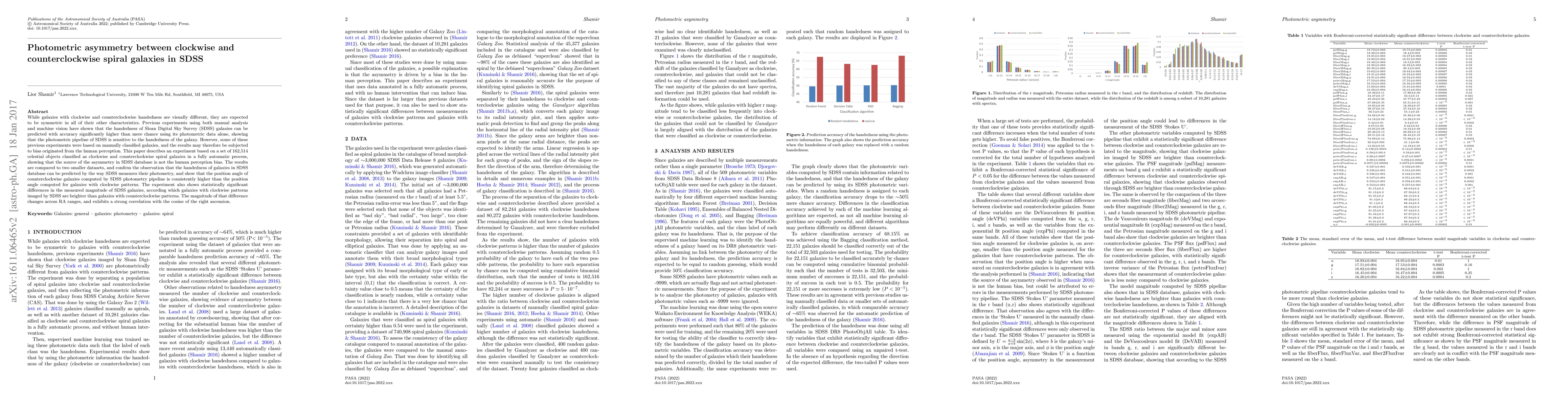 The paper presents a comprehensive analysis of photometric asymmetry between clockwise and counterclockwise spiral galaxies using an extensive, fully automatic dataset from the SDSS, identifying significant differences in position angles and magnitudes.