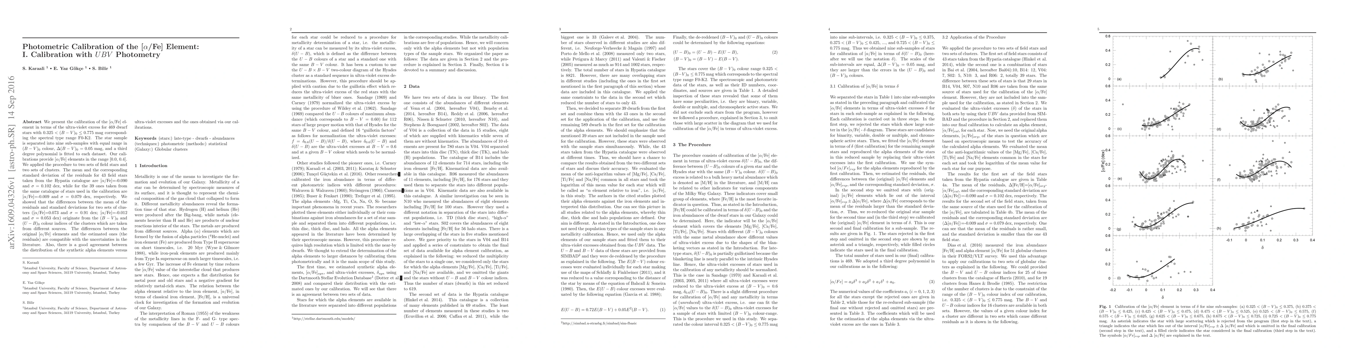 We present the calibration of the [$\alpha$/Fe] element in terms of the ultra-violet excess for 469 dwarf stars with $0.325<(B-V)_0 \leq 0.775$ mag corresponding the spectral type range F0-K2. The star sample is separated into nine sub-samples with equal range in $(B-V)_0$ colour, $\Delta(B-V)_0=0.05$ mag, and a third degree polynomial is fitted to each dataset. Our calibrations provide [$\alpha$/Fe] elements in the range [0.0, 0.4]. We applied the procedure to two sets of field stars and two sets of clusters. The mean and the corresponding standard deviation of the residuals for 43 field stars taken from the Hypatia catalogue are [$\alpha$/Fe]=-0.090 and $\sigma =0.102$ dex, while for the 39 ones taken from the same catalogue of stars used in the calibration are [$\alpha$/Fe]=-0.009 and $\sigma = 0.079$ dex, respectively. We showed that the differences between the mean of the residuals and standard deviations for two sets of clusters ([$\alpha$/Fe]=0.073 and $\sigma = 0.91$ dex; [$\alpha$/Fe]=-0.012 and $\sigma = 0.053$ dex) originate from the $(B-V)_0$ and $(U-B)_0$ colour indices of the clusters which are taken from different sources. The differences between the original [$\alpha$/Fe] elements and the estimated ones (the residuals) are compatible with the uncertainties in the literature. Also, there is a good agreement between the distribution of the synthetic alpha elements versus ultra-violet excesses and the ones obtained via our calibrations.
