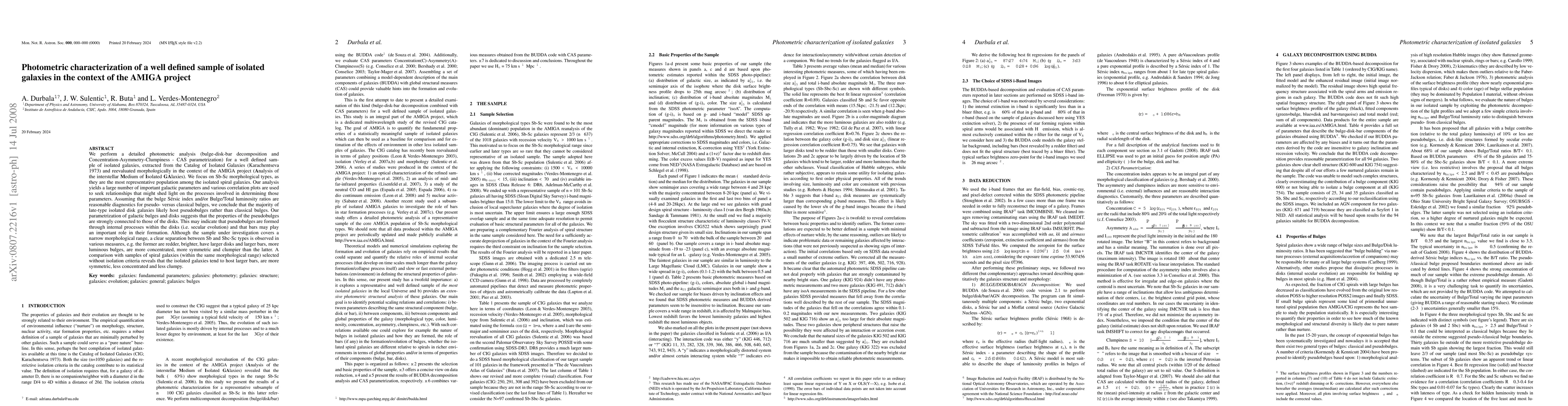We perform a detailed photometric analysis (bulge-disk-bar decomposition and Concentration-Asymmetry-Clumpiness - CAS parametrization) for a well defined sample of isolated galaxies, extracted from the Catalog of Isolated Galaxies (Karachentseva 1973) and reevaluated morphologically in the context of the AMIGA project. We focus on Sb-Sc morphological types, as they are the most representative population among the isolated spiral galaxies. Assuming that the bulge Sersic index and/or Bulge/Total luminosity ratios are reasonable diagnostics for pseudo- versus classical bulges, we conclude that the majority of late-type isolated disk galaxies likely host pseudobulges rather than classical bulges. Our parametrization of galactic bulges and disks suggests that the properties of the pseudobulges are strongly connected to those of the disks. This may indicate that pseudobulges are formed through internal processes within the disks (i.e. secular evolution) and that bars may play an important role in their formation. Although the sample under investigation covers a narrow morphological range, a clear separation between Sb and Sbc-Sc types is observed in various measures, e.g. the former are redder, brighter, have larger disks and larger bars, more luminous bulges, are more concentrated, more symmetric and clumpier than the latter. A comparison with samples of spiral galaxies (within the same morphological range) selected without isolation criteria reveals that the isolated galaxies tend to host larger bars, are more symmetric, less concentrated and less clumpy.