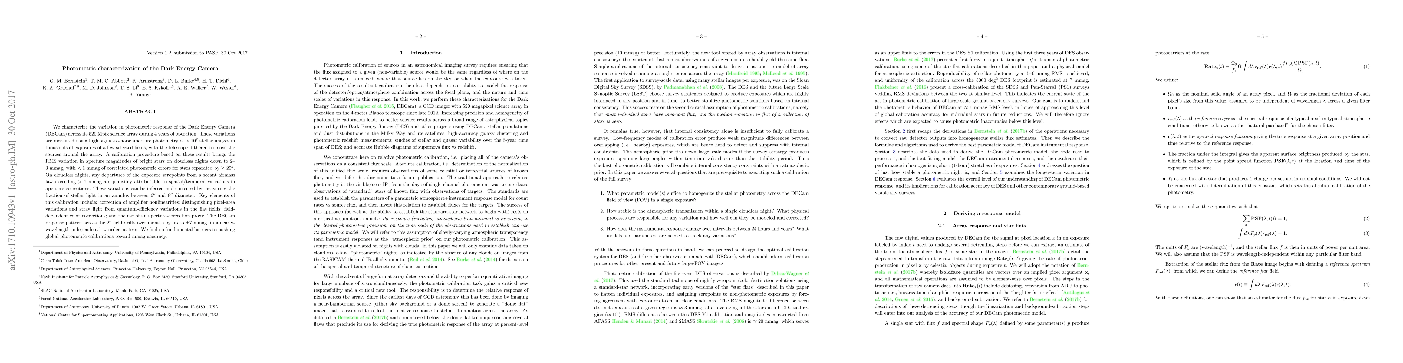 This paper characterizes the photometric response of the Dark Energy Camera (DECam) over four years, achieving an RMS variation of 2-3 mmag for bright stars on clear nights. The calibration method corrects for various factors, including amplifier nonlinearities and spatial/temporal variations, and demonstrates the potential for mmag-level photometric accuracy.