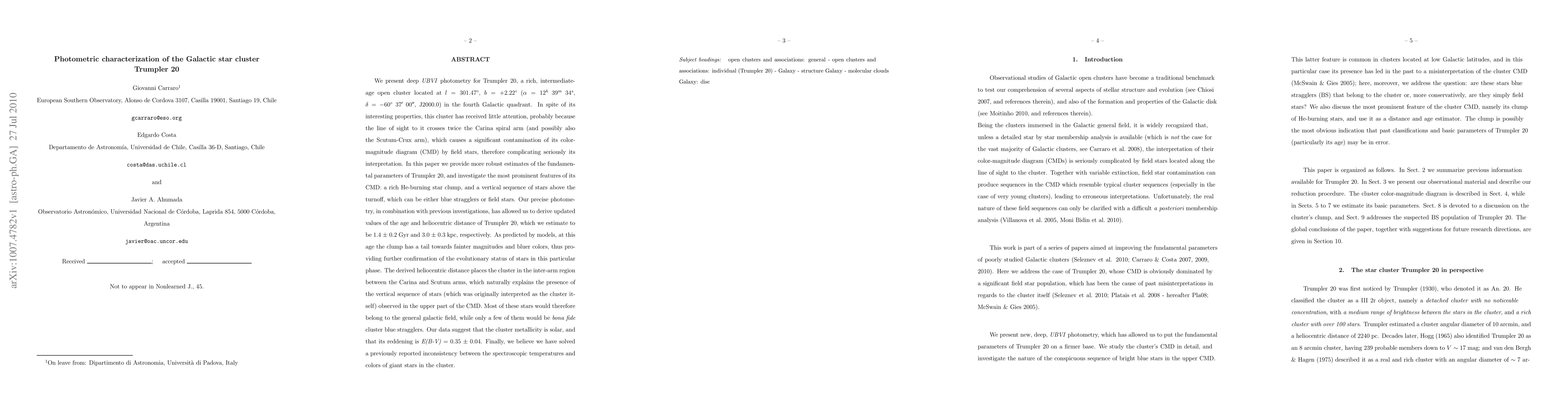 This paper presents deep UBVI photometry for the understudied open cluster Trumpler 20, revealing its age at 1.4 ± 0.2 Gyr and a heliocentric distance of 3.0 ± 0.3 kpc. The analysis clarifies the cluster's features, including a He-burning star clump and a vertical sequence of stars likely from the galactic field rather than the cluster itself.