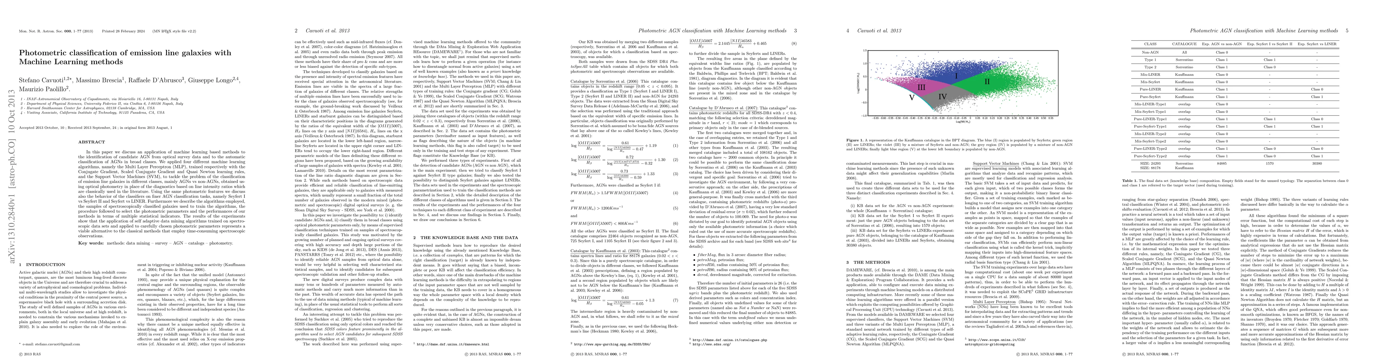 In this paper we discuss an application of machine learning based methods to the identification of candidate AGN from optical survey data and to the automatic classification of AGNs in broad classes. We applied four different machine learning algorithms, namely the Multi Layer Perceptron (MLP), trained respectively with the Conjugate Gradient, Scaled Conjugate Gradient and Quasi Newton learning rules, and the Support Vector Machines (SVM), to tackle the problem of the classification of emission line galaxies in different classes, mainly AGNs vs non-AGNs, obtained using optical photometry in place of the diagnostics based on line intensity ratios which are classically used in the literature. Using the same photometric features we discuss also the behavior of the classifiers on finer AGN classification tasks, namely Seyfert I vs Seyfert II and Seyfert vs LINER. Furthermore we describe the algorithms employed, the samples of spectroscopically classified galaxies used to train the algorithms, the procedure followed to select the photometric parameters and the performances of our methods in terms of multiple statistical indicators. The results of the experiments show that the application of self adaptive data mining algorithms trained on spectroscopic data sets and applied to carefully chosen photometric parameters represents a viable alternative to the classical methods that employ time-consuming spectroscopic observations.