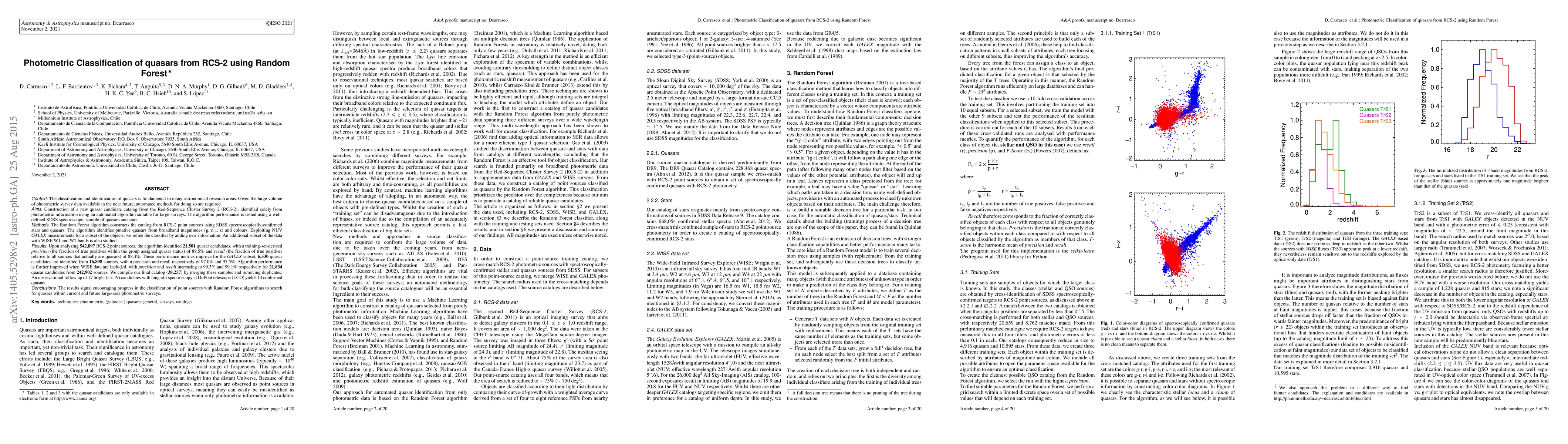 Aims. Construction of a new quasar candidate catalog from the Red-Sequence Cluster Survey 2 (RCS-2), identified solely from photometric information using an automated algorithm suitable for large surveys. The algorithm performance is tested using a well-defined SDSS spectroscopic sample of quasars and stars. Methods. The Random Forest algorithm constructs the catalog from RCS-2 point sources using SDSS spectroscopically-confirmed stars and quasars. The algorithm identifies putative quasars from broadband magnitudes (g, r, i, z) and colours. Exploiting NUV GALEX measurements for a subset of the objects, we refine the classifier by adding new information. An additional subset of the data with WISE W1 and W2 bands is also studied. Results. Upon analyzing 542,897 RCS-2 point sources, the algorithm identified 21,501 quasar candidates, with a training-set-derived precision (the fraction of true positives within the group assigned quasar status) of 89.5% and recall (the fraction of true positives relative to all sources that actually are quasars) of 88.4%. These performance metrics improve for the GALEX subset; 6,530 quasar candidates are identified from 16,898 sources, with a precision and recall respectively of 97.0% and 97.5%. Algorithm performance is further improved when WISE data are included, with precision and recall increasing to 99.3% and 99.1% respectively for 21,834 quasar candidates from 242,902 sources. We compile our final catalog (38,257) by merging these samples and removing duplicates. An observational follow up of 17 bright (r < 19) candidates with long-slit spectroscopy at DuPont telescope (LCO) yields 14 confirmed quasars. Conclusions. The results signal encouraging progress in the classification of point sources with Random Forest algorithms to search for quasars within current and future large-area photometric surveys.