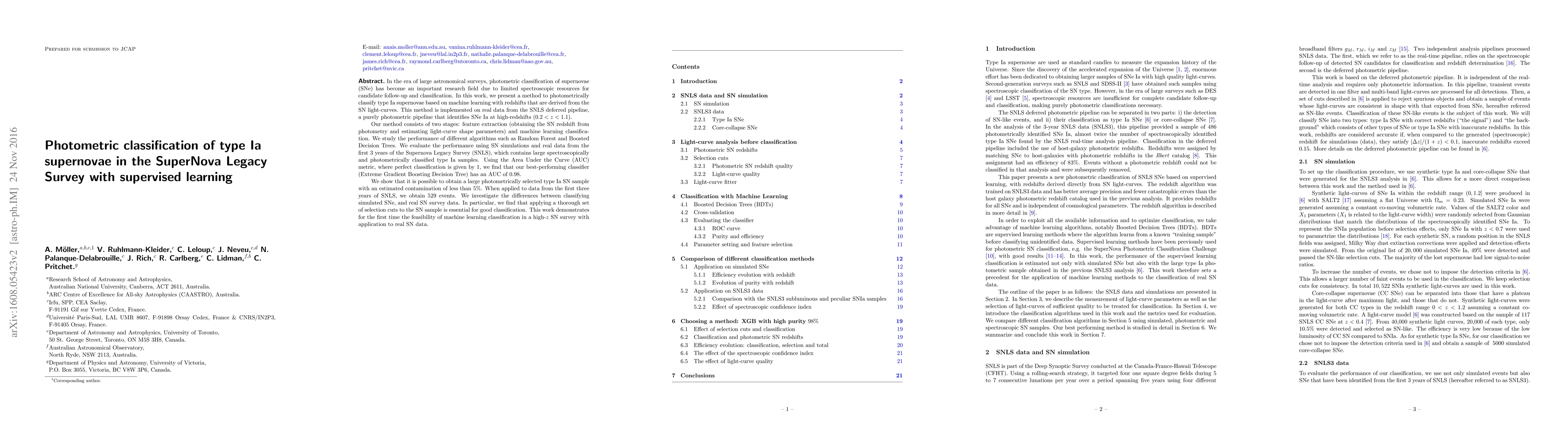 This paper presents a machine learning method for photometrically classifying type Ia supernovae using data from the SuperNova Legacy Survey (SNLS). The method achieves high classification accuracy with an AUC of 0.98, demonstrating the feasibility of large-scale photometric classification in high-redshift surveys.