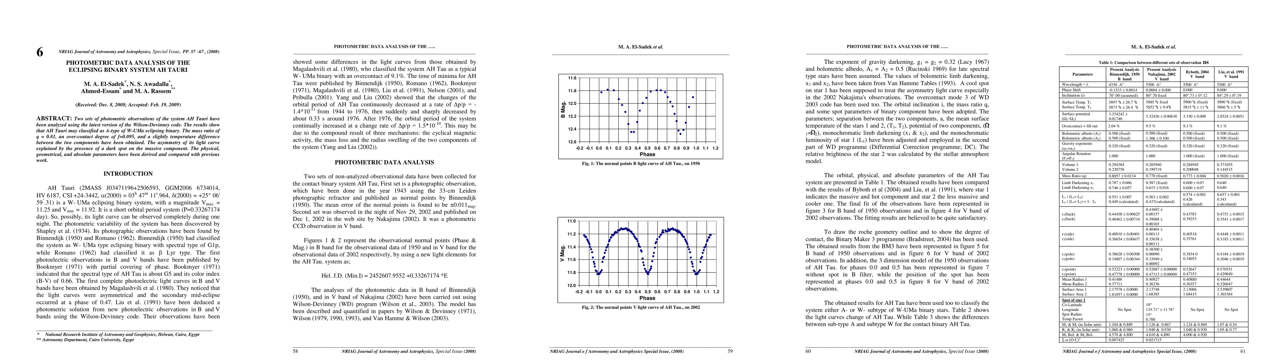 Two sets of photometric observations of the system AH Tauri have been analyzed using the latest version of the Wilson-Devinney code. The results show that AH Tauri may classified as A-type of W-UMa eclipsing binary. The mass ratio of q = 0.81, an over-contact degree of f = 0.095, and a slightly temperature difference between the two components have been obtained. The asymmetry of its light curve explained by the presence of a dark spot on the massive component. The physical, geometrical, and absolute parameters have been derived and compared with previous work.