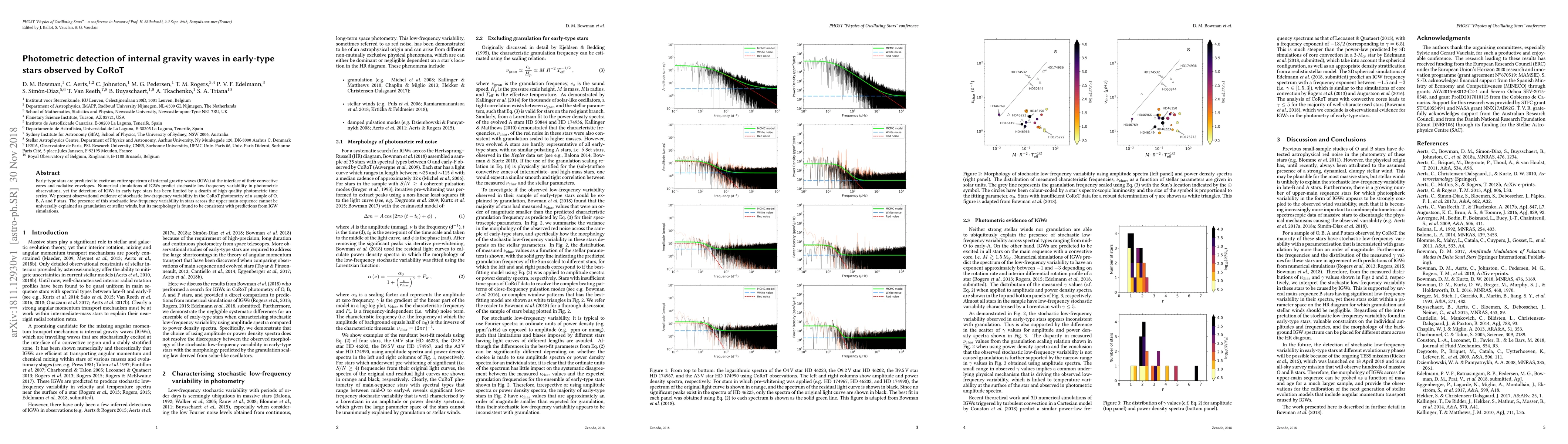 This paper reports the detection of stochastic low-frequency variability in CoRoT photometry of early-type stars, suggesting the presence of internal gravity waves (IGWs) at the interface of their convective cores and radiative envelopes. The observed variability aligns with IGW predictions, indicating a potential new observational method for studying these phenomena.