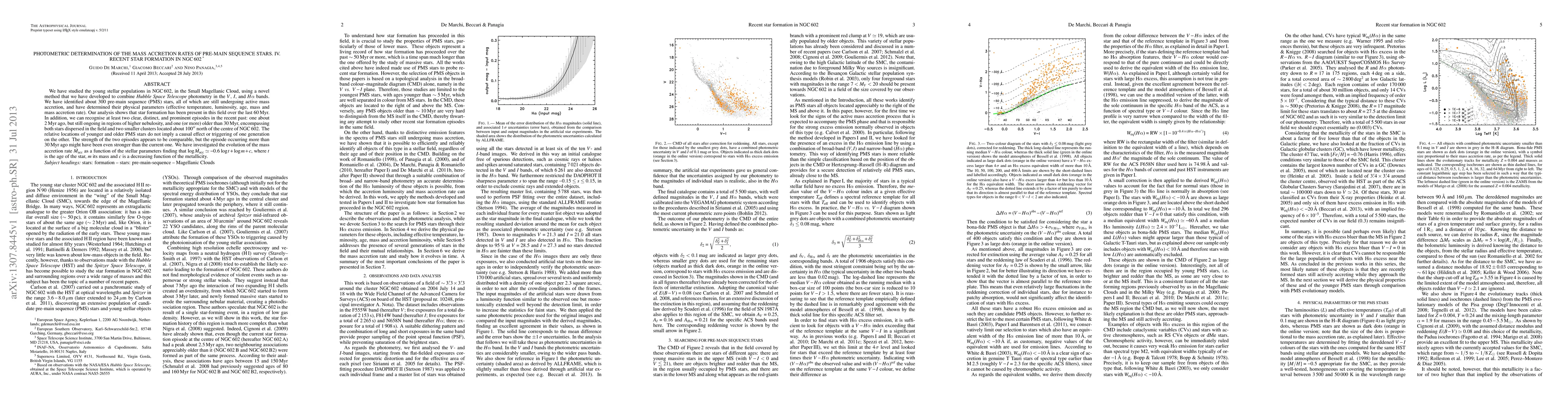 We have studied the young stellar populations in NGC 602, in the Small Magellanic Cloud, using a novel method that we have developed to combine Hubble Space Telescope photometry in the V, I, and Halpha bands. We have identified about 300 pre-main sequence (PMS) stars, all of which are still undergoing active mass accretion, and have determined their physical parameters (effective temperature, luminosity, age, mass and mass accretion rate). Our analysis shows that star formation has been present in this field over the last 60 Myr. In addition, we can recognise at least two clear, distinct, and prominent episodes in the recent past: one about 2 Myr ago, but still ongoing in regions of higher nebulosity, and one (or more) older than 30 Myr, encompassing both stars dispersed in the field and two smaller clusters located about 100 arcsec north of the centre of NGC 602. The relative locations of younger and older PMS stars do not imply a causal effect or triggering of one generation on the other. The strength of the two episodes appears to be comparable, but the episode occurring more than 30 Myr ago might have been even stronger than the current one. We have investigated the evolution of the mass accretion rate M_acc as a function of the stellar parameters finding that log M_acc ~ -0.6 log t + log m + c, where t is the age of the star, m its mass and c is a decreasing function of the metallicity.