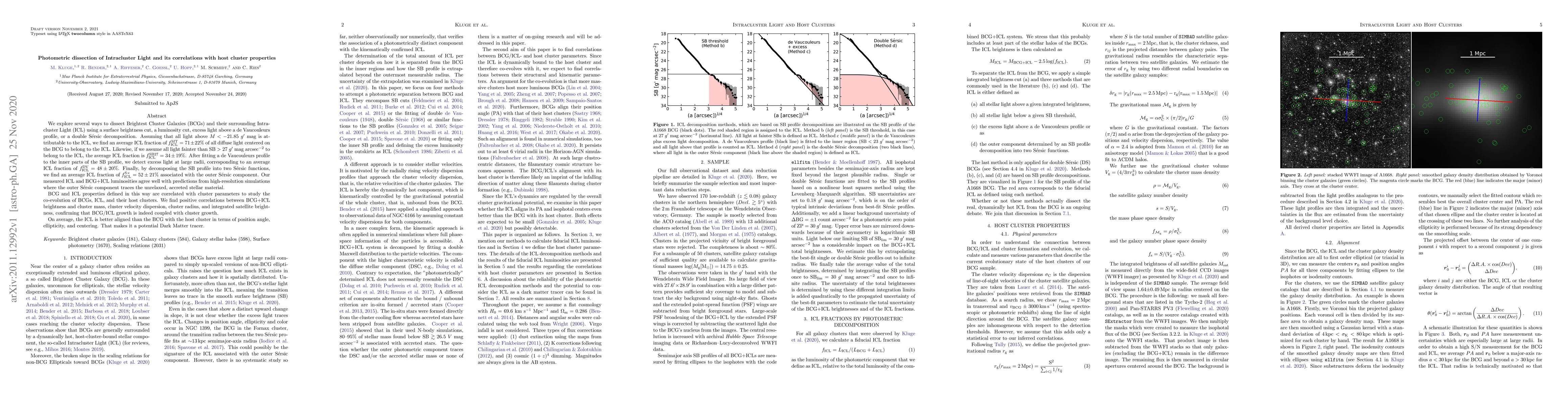 We explore several ways to dissect Brightest Cluster Galaxies (BCGs) and their surrounding Intracluster Light (ICL) using a surface brightness cut, a luminosity cut, excess light above a de Vaucouleurs profile, or a double S\'ersic decomposition. Assuming that all light above $M<-21.85~g'~\rm{mag}$ is attributable to the ICL, we find an average ICL fraction of $f^{\rm MT}_{\rm ICL}=71\pm22\%$ of all diffuse light centered on the BCG to belong to the ICL. Likewise, if we assume all light fainter than $\rm{SB}>27$ $g'$ mag arcsec$^{-2}$ to belong to the ICL, the average ICL fraction is $f^{\rm SB27}_{\rm ICL}=34\pm19\%$. After fitting a de Vaucouleurs profile to the inner parts of the SB profile, we detect excess light at large radii, corresponding to an average ICL fraction of $f^{\rm DV}_{\rm ICL}=48\pm20\%$. Finally, by decomposing the SB profile into two S\'ersic functions, we find an average ICL fraction of $f^{\rm S\times}_{\rm ICL}=52\pm21\%$ associated with the outer S\'ersic component. Our measured ICL and BCG+ICL luminosities agree well with predictions from high-resolution simulations where the outer S\'ersic component traces the unrelaxed, accreted stellar material. BCG and ICL properties defined in this way are correlated with cluster parameters to study the co-evolution of BCGs, ICL, and their host clusters. We find positive correlations between BCG+ICL brightness and cluster mass, cluster velocity dispersion, cluster radius, and integrated satellite brightness, confirming that BCG/ICL growth is indeed coupled with cluster growth. On average, the ICL is better aligned than the BCG with the host cluster in terms of position angle, ellipticity, and centering. That makes it a potential Dark Matter tracer.