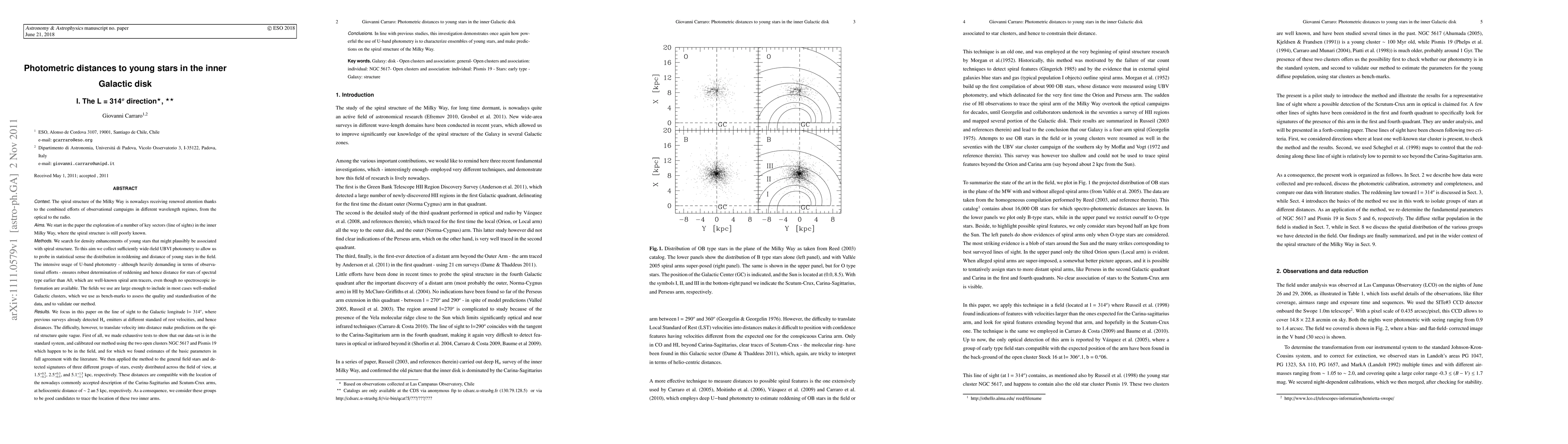 The spiral structure of the Milky Way is nowadays receiving renewed attention thanks to the combined efforts of observational campaigns in different wavelength regimes, from the optical to the radio. We start in the paper the exploration of a number of key sectors in the inner Milky Way, where the spiral structure is still poorly known. We search for density enhancements of young stars that might plausibly be associated with spiral structure. To this aim we collect sufficiently wide-field UBVI photometry. The intensive usage of U-band photometry ensures robust determination of reddening and hence distance for stars of spectral type earlier than A0, which are well-known spiral arm tracers. The fields we use are large enough to include in most cases well-studied Galactic clusters, which we use as bench-marks to assess the quality and standardisation of the data, and to validate our method. We focus in this paper on the line of sight to the Galactic longitude l= 314$^o$. First of all, we made exhaustive tests to show that our data-set is in the standard system, and calibrated our method using the two open clusters NGC 5617 and Pismis 19 which happen to be in the field, and for which we found estimates of the basic parameters in full agreement with the literature. We then applied the method to the general field stars and detected signatures of three different groups of stars, evenly distributed across the field of view, at 1.5$^{+0.5}_{-0.2}$, 2.5$^{+0.3}_{-0.5}$, and 5.1$^{+1.5}_{-1.1}$ kpc, respectively. These distances are compatible with the location of the nowadays commonly accepted description of the Carina-Sagittarius and Scutum-Crux arms, at heliocentric distance of $\sim$ 2 an 5 kpc,