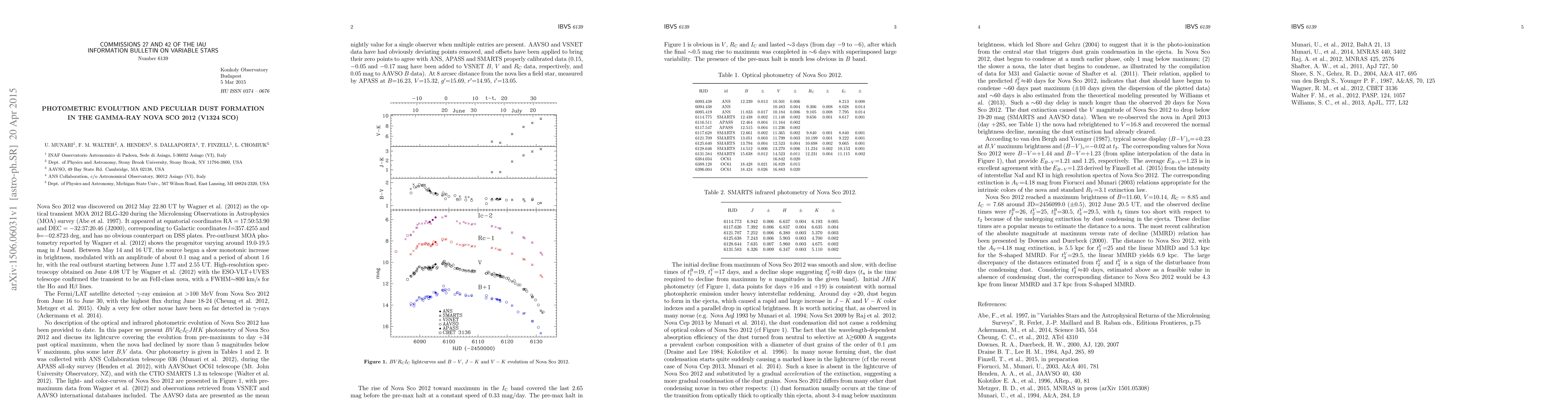Optical (BVRI) and infrared (JHK) photometry of the gamma-ray nova Nova Sco 2012 (V1324 Sco) is presented and the lightcurve reconstructed and discussed. An interstellar reddening E(B-V)=1.23 is derived. Dust begun to form at an early date in the nova, only one magnitude down and 20 days past maximum optical brightness and caused an extinction of at least 6 magnitudes in V band, that cleared some months later. This unusual early dust formation compromises the application of the magnitude at maximum versus rate of decline (MMRD) relations in estimating the distance to the nova.