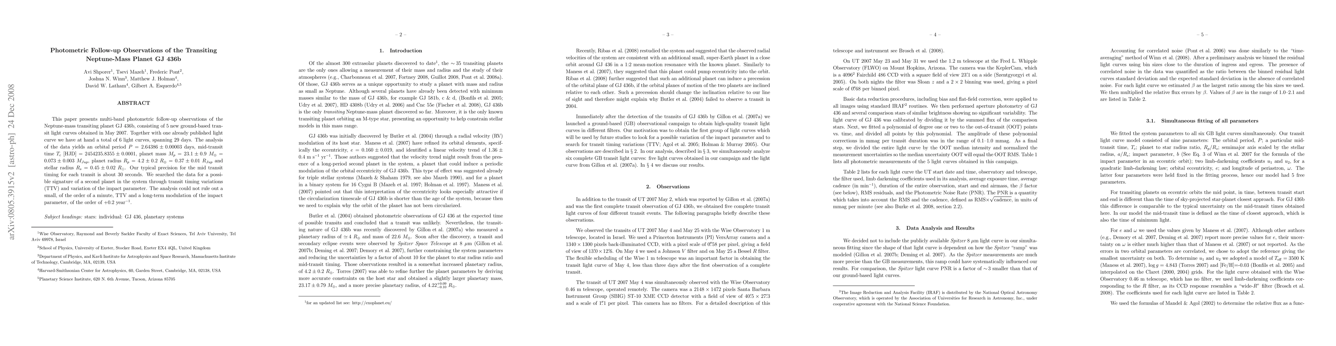 This paper reports multi-band photometric observations of the transiting Neptune-mass planet GJ 436b, yielding refined orbital and physical parameters including a precise orbital period and mid-transit time, while also hinting at possible transit timing variations and impact parameter modulation.