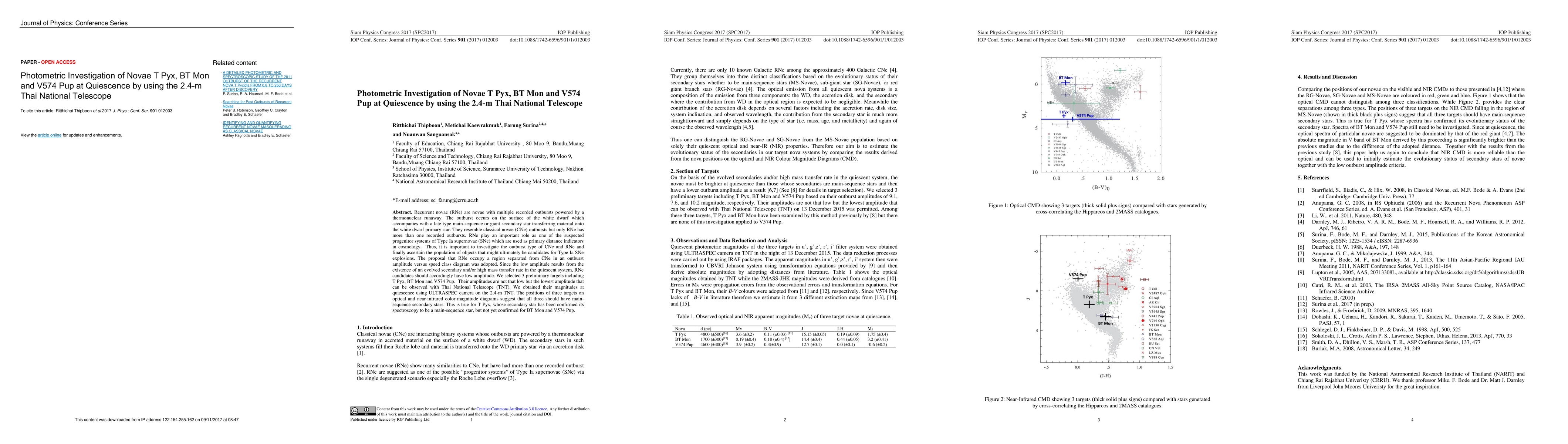 Researchers investigated three recurrent novae (RNe) to understand their outburst characteristics and explore their potential connection to Type Ia supernovae in cosmology. They used the 2.4 m Thai National Telescope to observe the quiescent states of T Pyx, BT Mon, and V574 Pup.