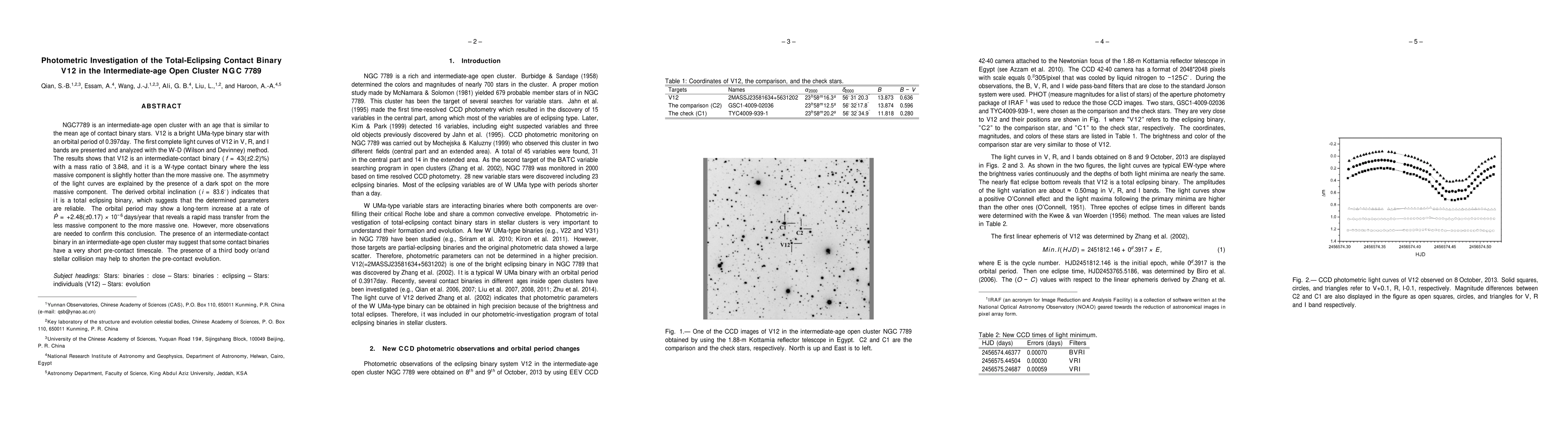 This paper presents the first complete light curves of the total-eclipsing contact binary V12 in the open cluster NGC 7789, analyzed using the W-D method, revealing it to be an intermediate-contact binary with a mass ratio of 3.848 and a potential long-term increase in orbital period suggesting mass transfer.