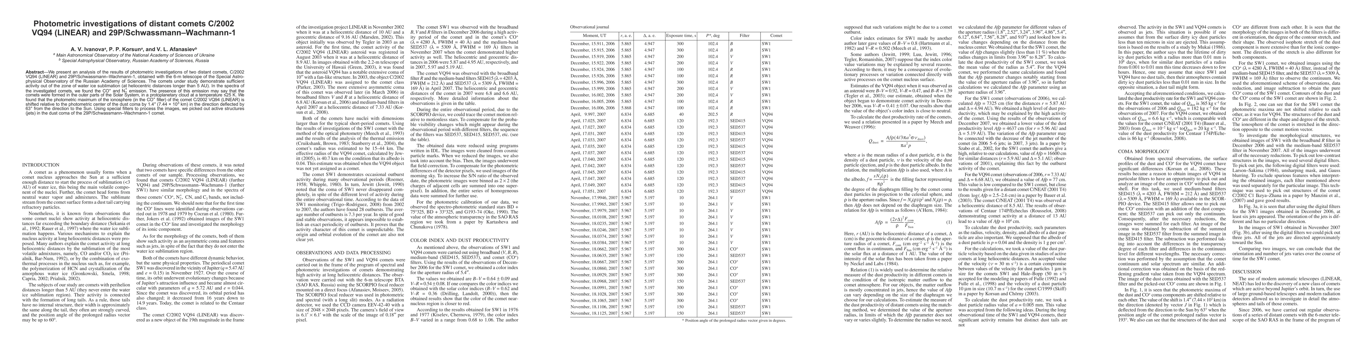 We present an analysis of the results of photometric investigations of two distant comets, C/2002 VQ94 (LINEAR) and 29P/Schwassmann-Wachmann 1, obtained with the 6m telescope of the Special Astrophysical Observatory of the Russian Academy of Sciences. The comets under study demonstrate sufficient activity out of the zone of water ice sublimation (at heliocentric distances longer than 5 AU). In the spectra of the investigated comets, we found the CO+ and N2+ emission. The presence of this emission may say that the comets were formed in the outer parts of the Solar System, in a protoplanetary cloud at a temperature <=25 K. We found that the photometric maximum of the ionosphere (in the CO+ filter) of the comet C/2002 VQ94 (LINEAR) is shifted relative to the photometric center of the dust coma by 1.4 arcsec (7.44*10^3 km) in the direction deflected by 63 deg from the direction to the Sun. Using special filters to process the images, we picked out active structures (jets) in the dust coma of the 29P/Schwassmann-Wachmann 1 comet.