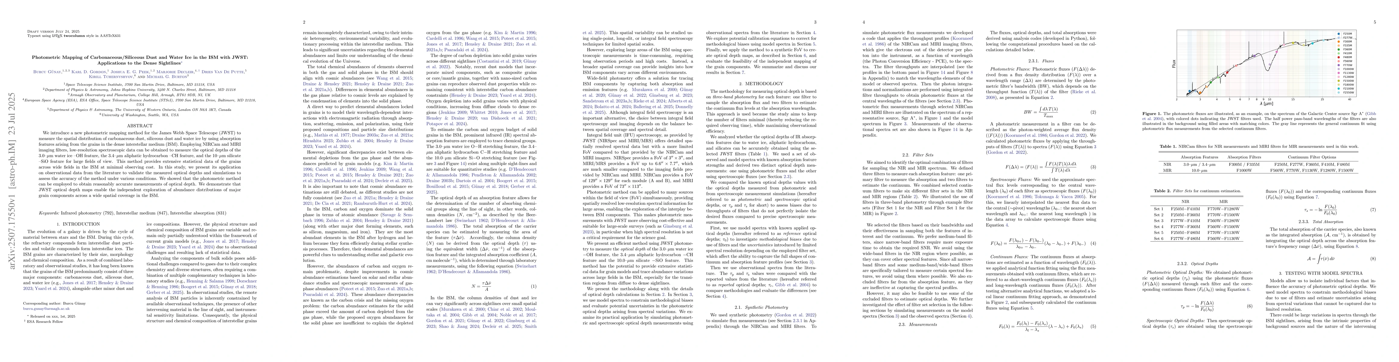 We introduce a new photometric mapping method for the James Webb Space Telescope (JWST) to measure the spatial distribution of carbonaceous dust, siliceous dust and water ice by using absorption features arising from the grains in the dense interstellar medium (ISM). Employing NIRCam and MIRI imaging filters, low-resolution spectroscopic data can be obtained to measure the optical depths of the 3.0-$\mu$m water ice -OH feature, the 3.4-$\mu$m aliphatic hydrocarbon -CH feature, and the 10-$\mu$m silicate -SiO feature for large fields of view. This method provides extensive statistical data of the grains across wide fields in the ISM at minimal observing cost. In this study, we present its application on observational data from the literature to validate the measured optical depths and simulations to assess the accuracy of the method under various conditions. We showed that the photometric method can be employed to obtain reasonably accurate measurements of optical depth. We demonstrate that JWST optical depth maps enable the independent exploration of abundance distributions of major grain components across a wide spatial coverage in the ISM.