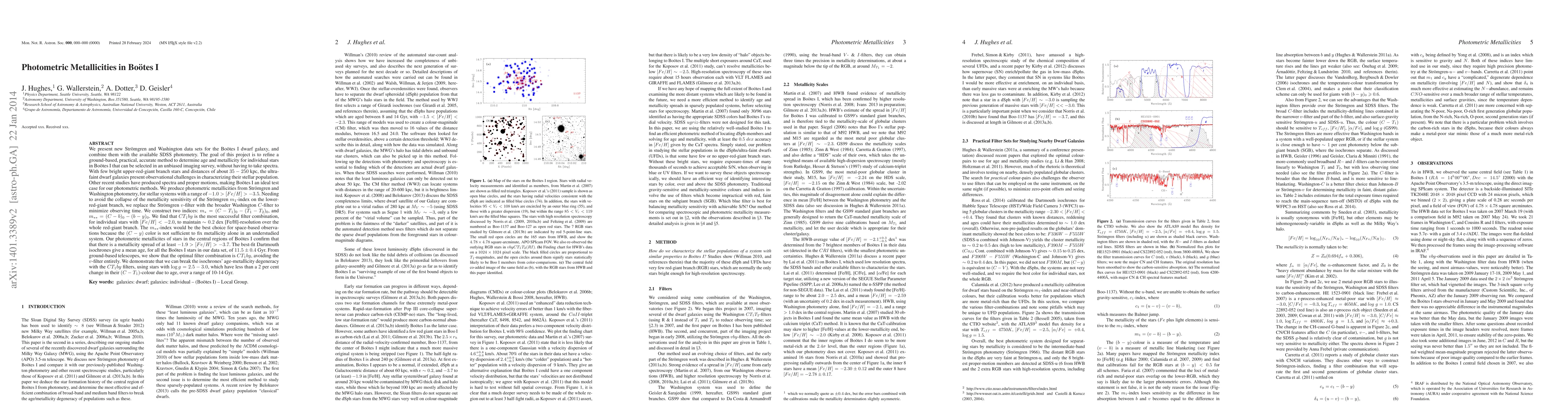 This paper presents new photometric data for the Bootes I dwarf galaxy, combining Stromgren, Washington, and SDSS data to develop a method for determining stellar age and metallicity without requiring spectra. The study finds that the Washington C-filter combined with the $CT_1$ filter provides the best resolution for metallicities in the range $-1.0>[Fe/H]>-3.5$, effectively breaking the age-metallicity degeneracy in stars.