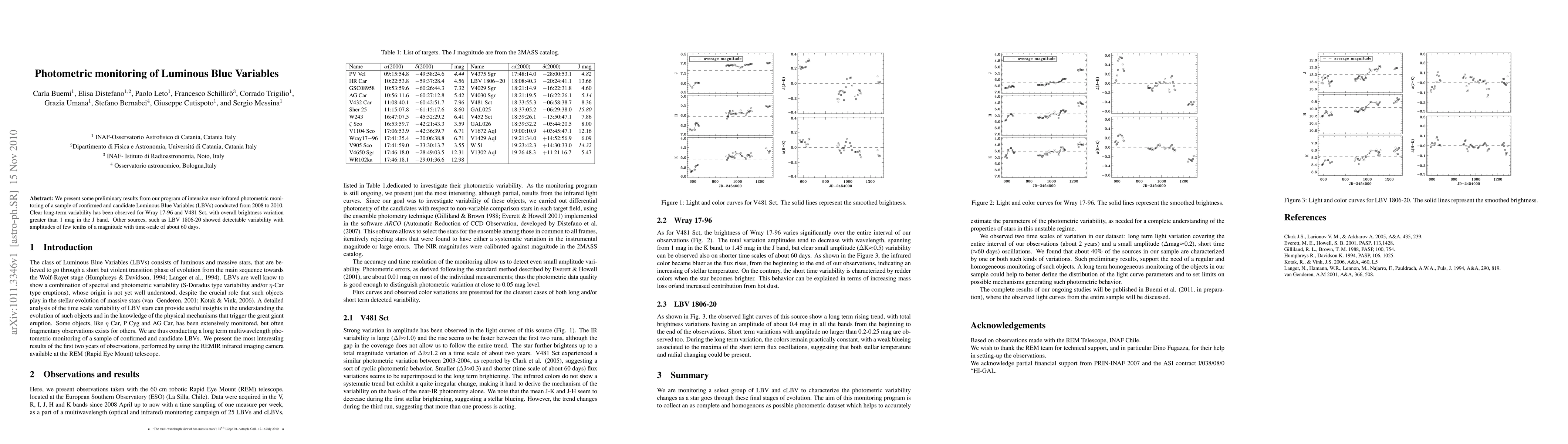 We present some preliminary results from our program of intensive near-infrared photometric monitoring of a sample of confirmed and candidate Luminous Blue Variables (LBVs) conducted from 2008 to 2010. Clear long-term variability has been observed for Wray 17-96 and V481 Sct, with overall brightness variation greater than 1 mag in the J band. Other sources, such as LBV 1806-20 showed detectable variability with amplitudes of few tenths of a magnitude with time-scale of about 60 days.