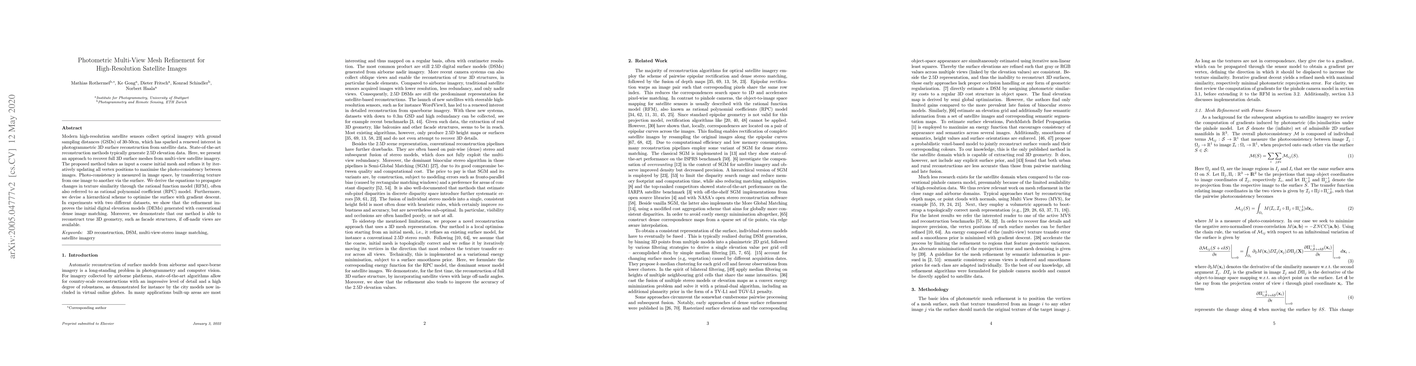This paper proposes a method for refining 3D surface meshes from multi-view high-resolution satellite imagery, improving initial digital elevation models through iterative updates that maximize photo-consistency. The approach leverages a hierarchical optimization scheme and rational function model to achieve accurate 3D reconstructions, especially when off-nadir views are available.