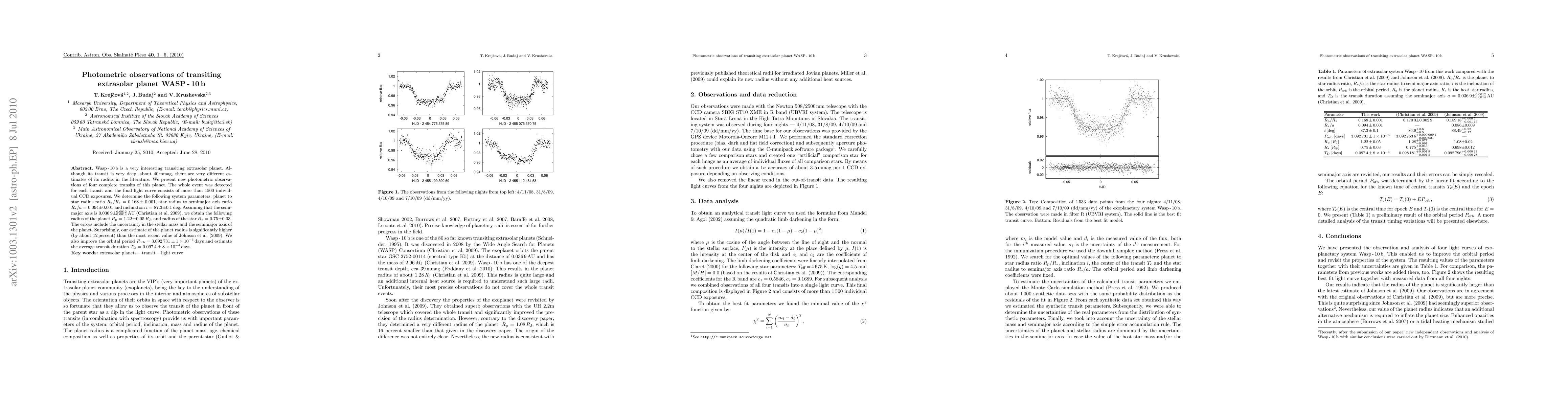 Wasp-10b is a very interesting transiting extrasolar planet. Although its transit is very deep, about 40 mmag, there are very different estimates of its radius in the literature. We present new photometric observations of four complete transits of this planet. The whole event was detected for each transit and the final light curve consists of more than 1500 individual CCD exposures. We determine the following system parameters: planet to star radius ratio R_p/R_star=0.168 +- 0.001, star radius to semimajor axis ratio R_star/a = 0.094 +- 0.001 and inclination i=87.3 +- 0.1 deg. Assuming that the semimajor axis is 0.036 9 +- ^{0.0012}_{0.0014} AU (Christian et al. 2009), we obtain the following radius of the planet R_p=1.22 +- 0.05 R_J, and radius of the star R_star = 0.75 +- 0.03. The errors include the uncertainty in the stellar mass and the semimajor axis of the planet. Surprisingly, our estimate of the planet radius is significantly higher (by about 12 percent) than the most recent value of Johnson et al. (2009). We also improve the orbital period P_orb=3.092 731 +- 1x10^{-6} days and estimate the average transit duration T_D=0.097 4 +- 8x10^{-4} days.