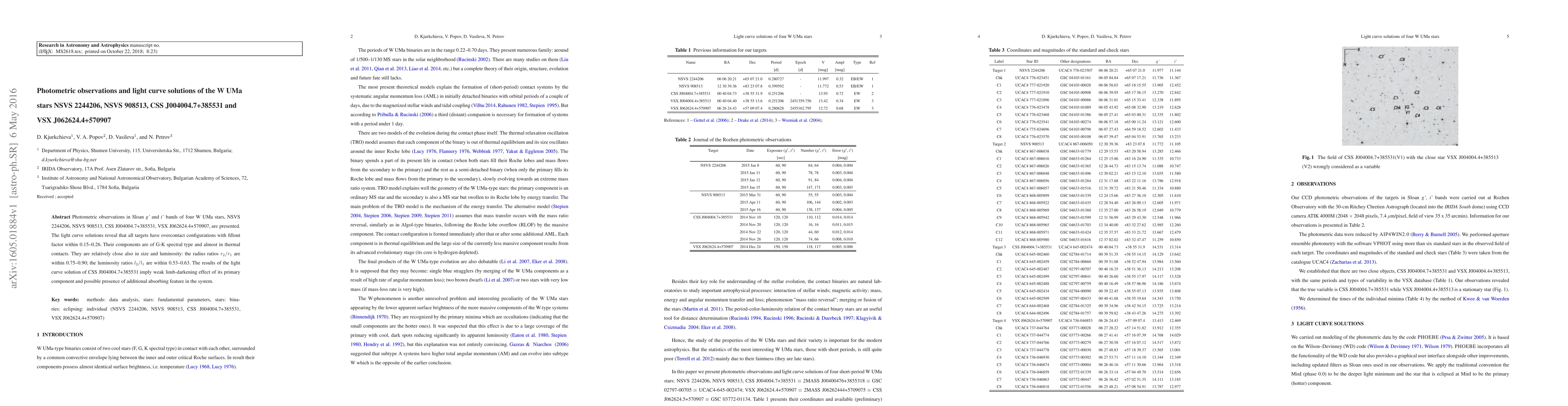 Photometric observations in Sloan g' and i' bands of four W UMa stars, NSVS 2244206, NSVS 908513, CSS J004004.7+385531, VSX J062624.4+570907, are presented. The light curve solutions reveal that all targets have overcontact configurations with fillout factor within 0.15-0.26. Their components are of G-K spectral type and almost in thermal contacts. They are relatively close also in size and luminosity: the radius rations r_2/r_1 are within 0.75-0.90; the luminosity ratios l_2/l_1 are within 0.53-0.63. The results of the light curve solution of CSS J004007.7+385531 imply weak limb-darkening effect of its primary component and possible presence of additional absorbing feature in the system.