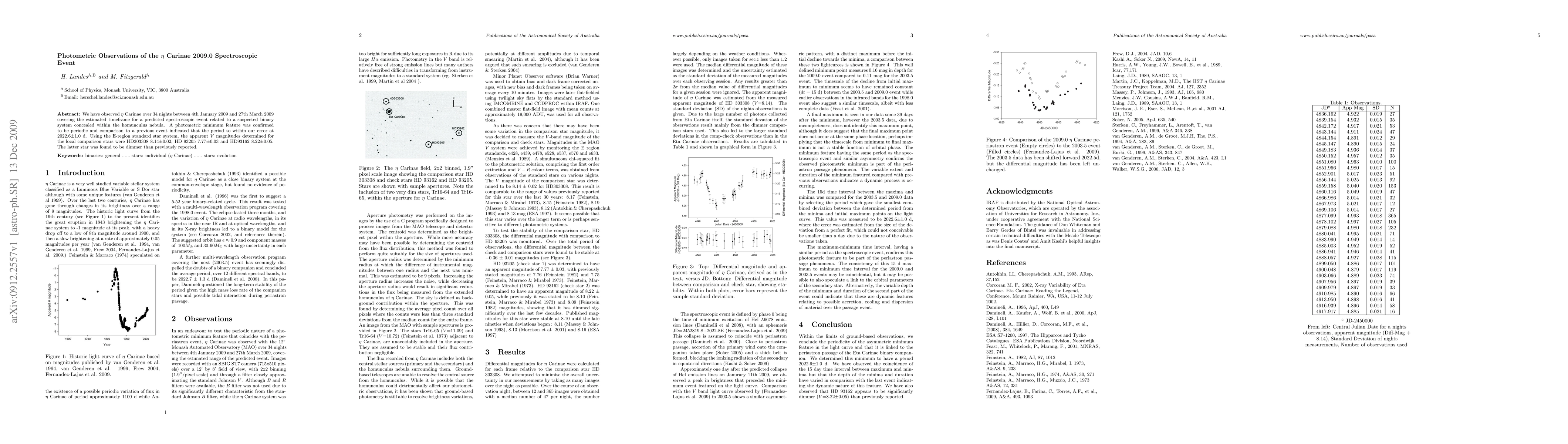We have observed Eta Carinae over 34 nights between 4th January 2009 and 27th March 2009 covering the estimated timeframe for a predicted spectroscopic event related to a suspected binary system concealed within the homunculus nebula. A photometric minimum feature was confirmed to be periodic and comparison to a previous event indicated that the period to within our error at 2022.6 +/-1.0 d. Using the E-region standard star system, the apparent V magnitudes determined for the local comparison stars were HD303308 8.14+/-0.02, HD 93205 7.77 +/-0.03 and HD93162 8.22 +/-0.05. The latter star was found to be dimmer than previously reported.