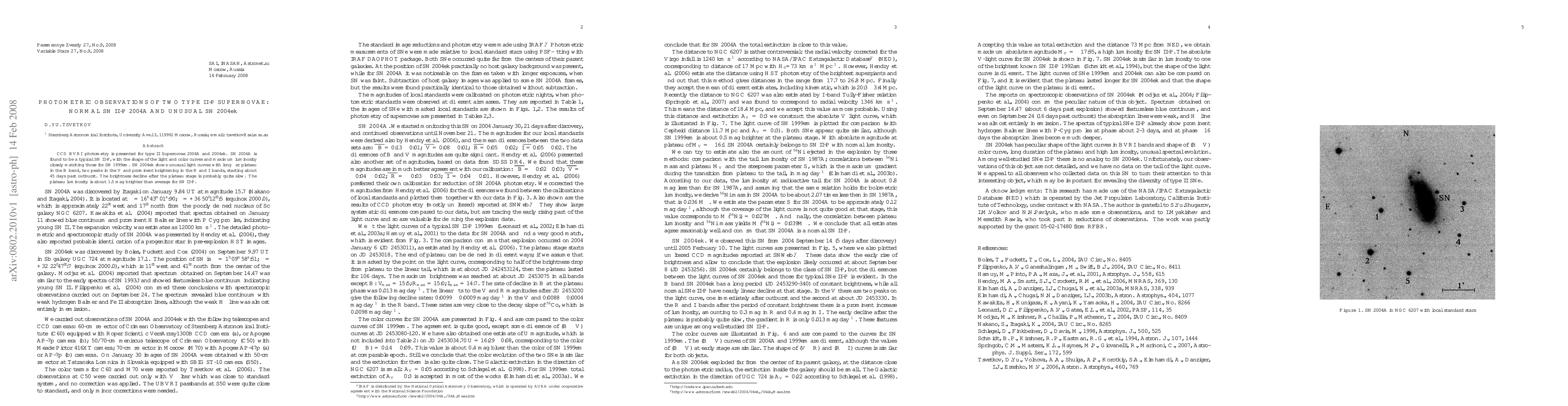 CCD BVRI photometry is presented for type II Supernovae 2004A and 2004ek. SN 2004A is found to be a typical SN II-P, with the shape of the light and color curves and maximum luminosity closely matching those for SN 1999em. SN 2004ek shows unusual light curves with long flat plateau in the B band, two peaks in the V and prominent brightening in the R and I bands, starting about 45 days past outburst. The brightness decline after the plateau stage is probably quite slow. The plateau luminosity is about 1.5 mag brighter than average for SN II-P.