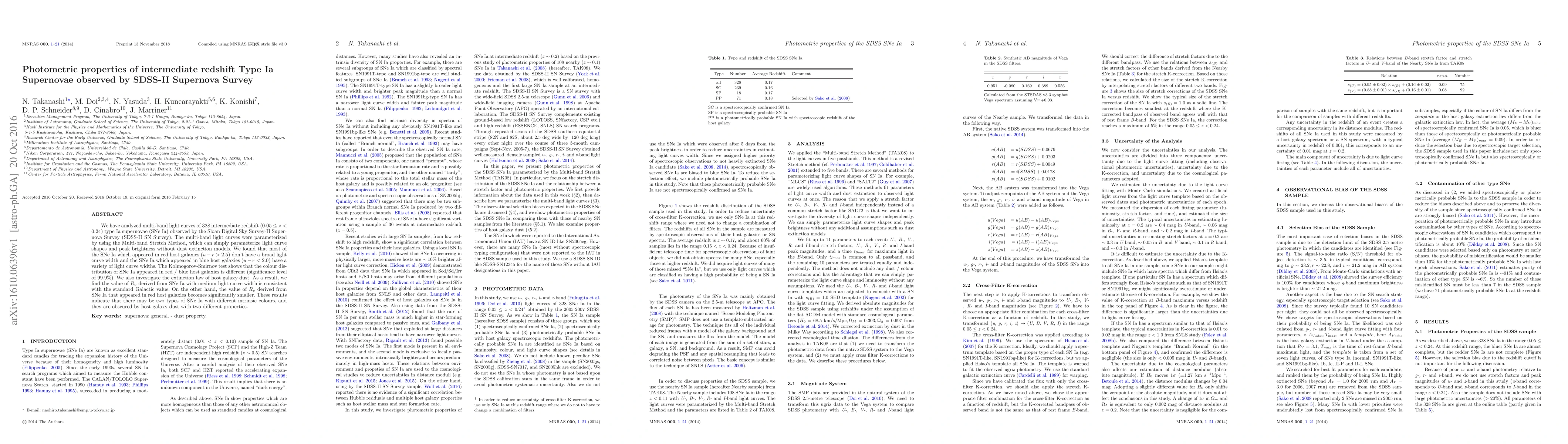 We have analyzed multi-band light curves of 328 intermediate redshift (0.05 <= z < 0.24) type Ia supernovae (SNe Ia) observed by the Sloan Digital Sky Survey-II Supernova Survey (SDSS-II SN Survey). The multi-band light curves were parameterized by using the Multi-band Stretch Method, which can simply parameterize light curve shapes and peak brightness without dust extinction models. We found that most of the SNe Ia which appeared in red host galaxies (u - r > 2.5) don't have a broad light curve width and the SNe Ia which appeared in blue host galaxies (u - r < 2.0) have a variety of light curve widths. The Kolmogorov-Smirnov test shows that the colour distribution of SNe Ia appeared in red / blue host galaxies is different (significance level of 99.9%). We also investigate the extinction law of host galaxy dust. As a result, we find the value of Rv derived from SNe Ia with medium light curve width is consistent with the standard Galactic value. On the other hand, the value of Rv derived from SNe Ia that appeared in red host galaxies becomes significantly smaller. These results indicate that there may be two types of SNe Ia with different intrinsic colours, and they are obscured by host galaxy dust with two different properties.